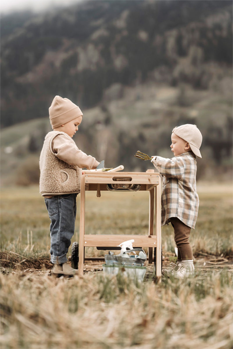 Máčanie, varenie a stavanie z vody a piesku! Táto vonkajšia „letná“ kuchynka na hranie je ideálna na malú záhradu, terasu alebo balkón. Napriek kompaktným rozmerom ponúka kuchynka dostatok priestoru pre kreatívnu hru. Dodáva sa s dvoma odnímateľnými miskami, ktoré dokážu rozohrať celý stavebný a kulinársky proces. Varná doska je vybavená otočnými gombíkmi a radom otvorov, ktoré môžu poslúžiť napríklad ako otvor pre vodnú hadicu. Vďaka robustným kolieskam je kuchynka ľahko premiestniteľná. Hodí sa ako doplnok alebo alternatíva pieskoviska a na výrobu najroztomilejších „pieskových“ báboviek a ďalších pochúťok. Hlavné vlastnosti: ideálna pre malú záhradu, terasu alebo balkónpraktické zapustené otvory pre hračky na piesok či hadicu na voduopatrené kolieskami, ľahko premiestniteľné neošetrené drevo vhodné na osobité úpravy a lakovanie