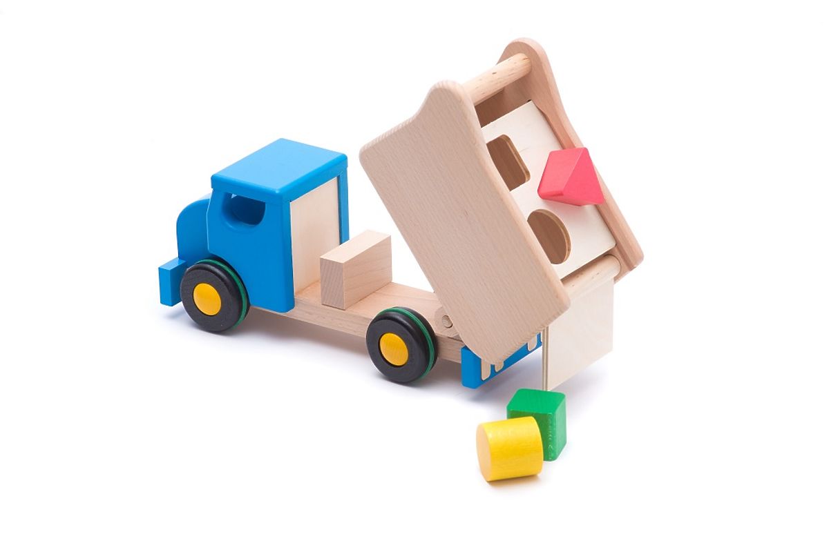 Drevené autíčko s farebnými vkladacími tvarmi a sklápacou hornou časťou. .. viac