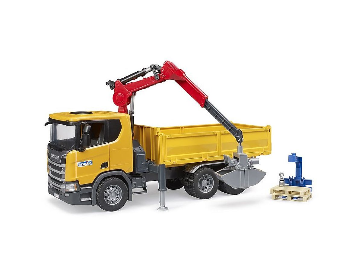 Rovnako ako ostatné modely Scania, aj tento sa vyznačuje svojou odolnosťou a robustnosťou. Nákladné auto má otváracie dvere, sklopné zrkadlá a je vhodné na hranie doma aj v teréne. Predná kabína tohto vozidla poskytuje komfortné pracovisko všetkým figúrkam zo sveta bworld. Za kabínou môžete vidieť nakladacie teleskopické rameno otočné o 360°. Pre ľahšie nakladanie a vykladanie poslúžia sklopné bočnice a nakladacia plošina. Stabilitu vozidla zabezpečujú podperné nohy. Súčasťou balenia sú dve palety, paletové vidly a drapák s lopatou. Hlavné vlastnosti: sklopné zrkadlá, otváracie dvere, rameno otočné o 360°, sklopné bočnice, podperné nohy, sklopná plošina, vhodné na hranie doma aj vonku, kompatibilné s figúrkami BRUDER bworld, vyrobené v Nemecku, vhodné od 4 rokov.