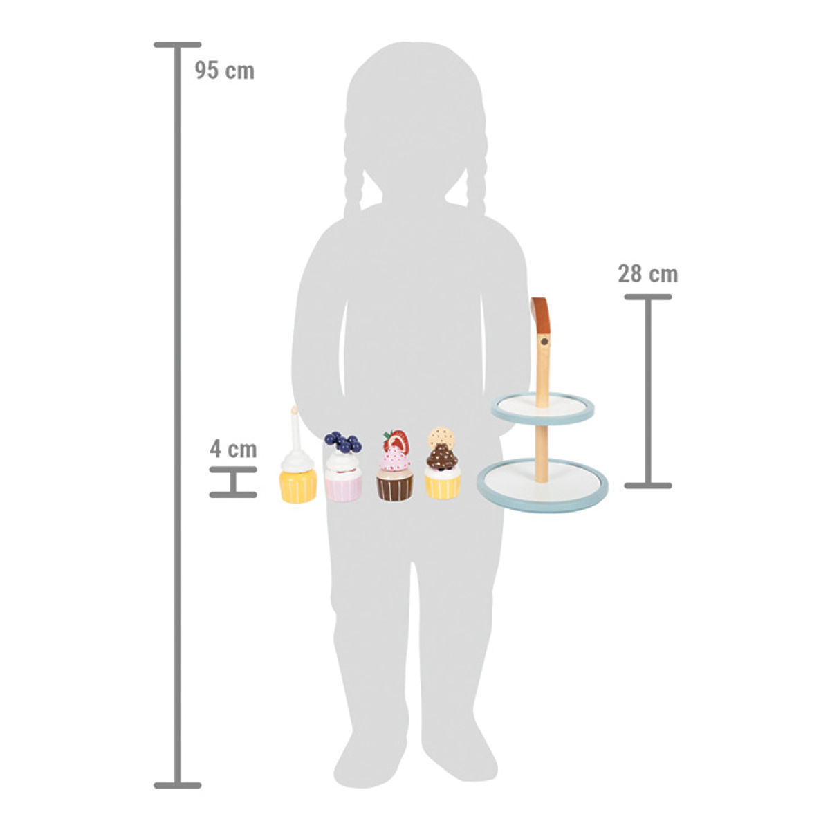 Pochúťky do detskej kuchynky. Tento stojan so štyrmi košíčkami pozýva malých cukrárov k aktívnej hre a prezentovaniu lahodných muffinov. Stojan má dve poschodia, ktoré slúžia na vystavenie cukroviniek v vrstvách. Systém kombinovateľných podstavcov a krémových vrškov umožňuje široké možnosti kombinácií. Jednotlivé dieliky držia spolu pomocou integrovaných magnetov. Sada je doplnená o dvojitú sušienku, jahodový rez, čučoriedky a narodeninovú sviečku, ktorou možno torty ozdobiť. To povzbudí chuť na čaj s bábikami, medvedíkmi atď. Komu sa z toho pohľadu nezbiehajú sliny? Ideálny doplnok do kuchynky a obchodu s potravinami. Detaily, ako je držadlo z tmavohnedej imitácie kože, integrované magnety a moderné, decentné škandinávske farby robia zo stojanu vysoko kvalitnú a štýlovú upútavku do detskej izby. Hlavné vlastnosti: decentné škandinávske farby inšpiruje a podnecuje ku konverzácii 1 stojan, 4 muffiny, 4 polevy, 1 sviečka, 1 sušienka, 1 jahoda, 1 čučoriedka