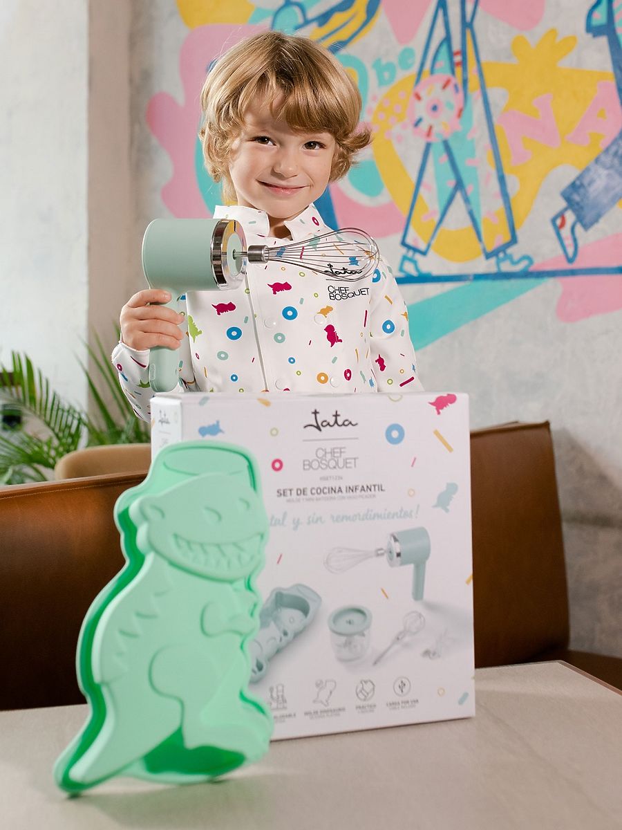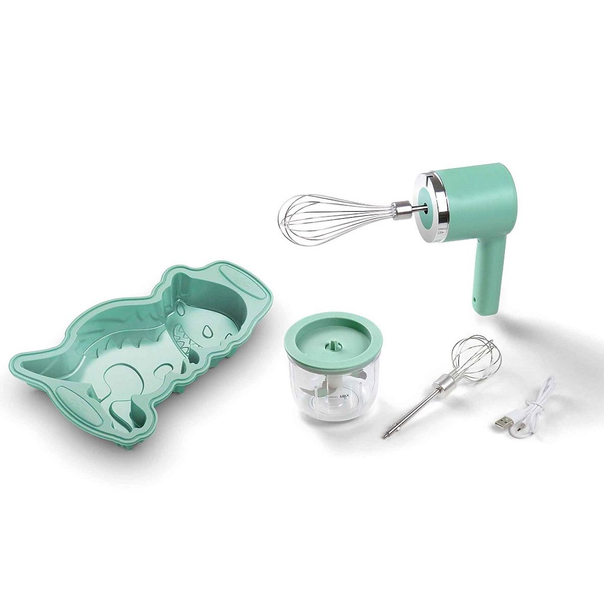 Trávia vaše deti rady čas v kuchyni a chcú byť samostatné? S touto sadou 3v1 môžu. Sada nástrojov na pečenie je to pravé pre malých kuchárov. Súčasťou je ručný šľahač, chopper (sekáčik) a silikónová forma na pečenie. Každý prvok tejto sady bol navrhnutý s dôrazom na praktickosť a jednoduchú ovládateľnosť. Šľahač aj chopper sú ľahké, takže ich deti bez problémov unesú a udržia. AKU ručný šľahač s 2 nadstavcami má 5 rýchlostí. Chopper (sekáčik) s objemom 300 ml. Silikónová forma v tvare dinosaura je nepriľnavá a flexibilná. Forma odoláva extrémnym teplotám: do 230 °C a -40°C, je teda vhodná do rúry na pečenie a tiež napr. do mrazničky. Rozmery formy sú 27x17x6 cm, kapacita 950 ml. BPA. Jednoduché nabíjanie pomocou USB kábla. USB kábel je súčasťou balenia. Tento spotrebič môžu používať deti, ak sú pod dozorom dospelej osoby alebo boli poučené o používaní spotrebiča bezpečným spôsobom a rozumejú prípadným nebezpečenstvám. Hlavné vlastnosti: 3v1 v jednom uľahčuje prípravu rôznych pokrmov skvelý pomocník v kuchyni