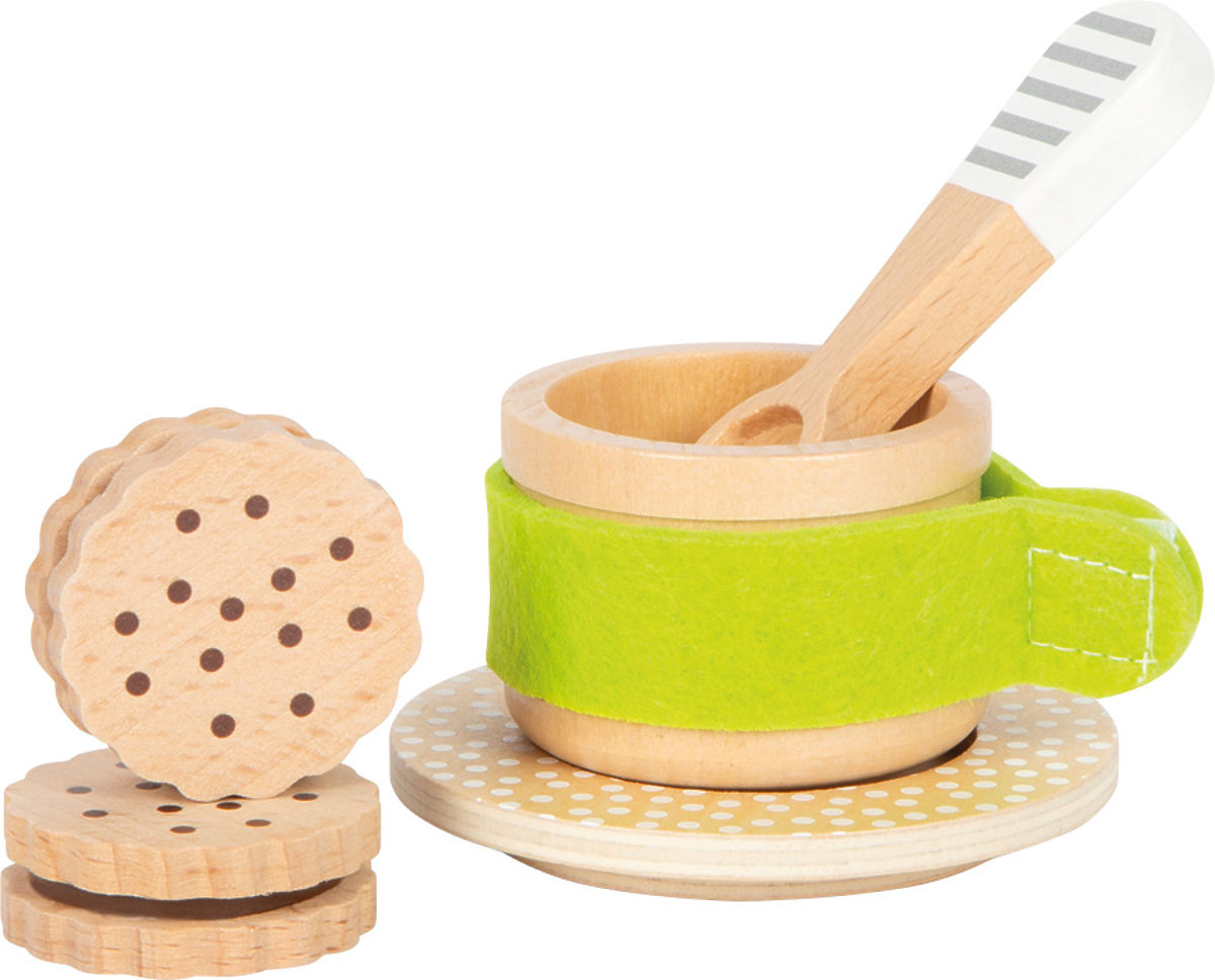 Všetci priatelia čaju a milovníci kávy pozor. Táto sada bola navrhnutá s ohľadom na najmenších hostiteľov, ktorí radi napodobňujú dospelých pri príprave kávy a čaju. Sada má krásny dizajn, zaujímavé detaily, vysoké množstvo drevených materiálov a hapticky príjemné plstené kúsky. Dva šálky s podšálkami, dve lyžičky, cukornička, kanvička na mlieko a veľká kanvica na kávu/čaj sú doplnené tanierom a sendvičovými sušienkami. Na cukorničke a kanvici na kávu/čaj je odnímateľné veko pre ešte väčšiu realistickú hru. Podporuje rozvoj predstavivosti a sociálnych zručností. Hlavné vlastnosti: podporuje kreativitu a sociálne zručnosti, vyrobené z dreva a plstených doplnkov, skvelý doplnok do detskej kuchynky, hapticky príjemné plstené kúsky