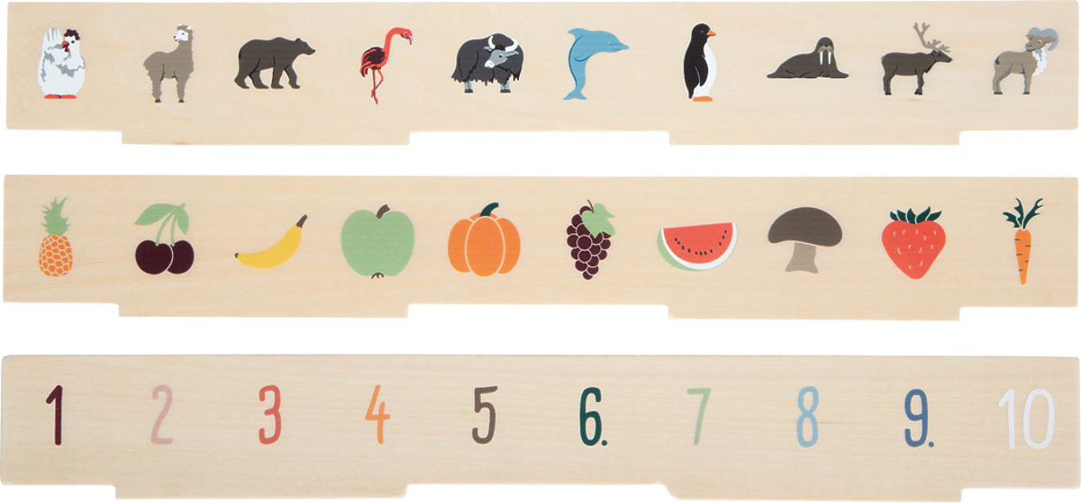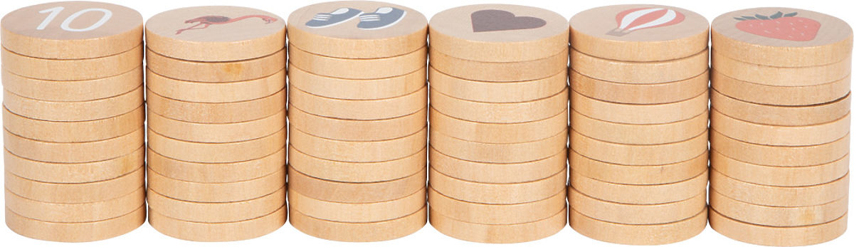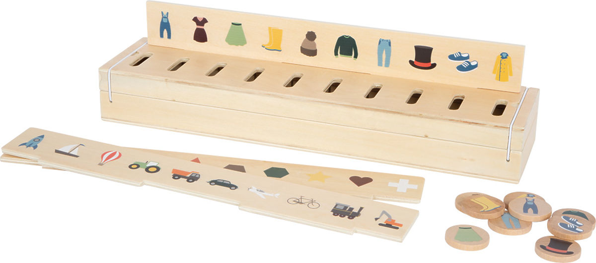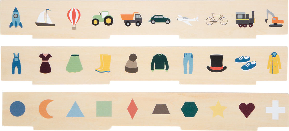 Tento drevený zásobník ponúka množstvo motívov na objavovanie s tromi obojstrannými vkladacími panelmi a 60 ks obrázkových žetónov na tému doprava, zvieratá, čísla, tvary, oblečenie, ovocie a zelenina. Pri triedení a vkladaní žetónov do krabičky si deti trénujú jemnú motoriku, rozpoznávanie farieb a tvarov zábavným spôsobom. Motívy možno tiež využiť na učenie slov a zdokonaľovanie slovnej zásoby zábavnou formou. Desať samostatných priehradiek vo vnútri dreveného zásobníka a dve západky na gumičku zabezpečujú bezpečné uloženie obsahu. Praktická učebná hračka vhodná aj keď ste na cestách. Hlavné vlastnosti: tri obojstranné obrazové panely možnosť uložiť do uzatvárateľného zásobníka učebná hračka vhodná aj na cesty rozpoznávanie farieb a tvarov zábavným spôsobom rozšírenie slovnej zásoby