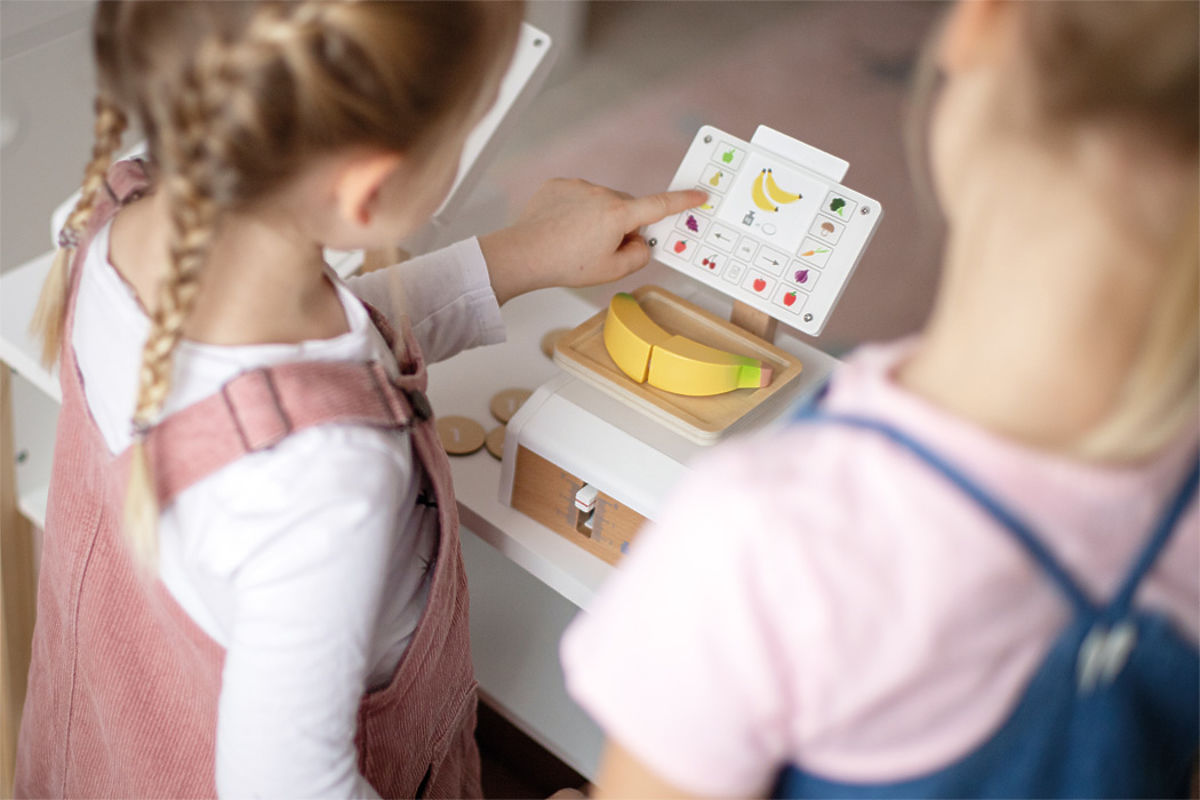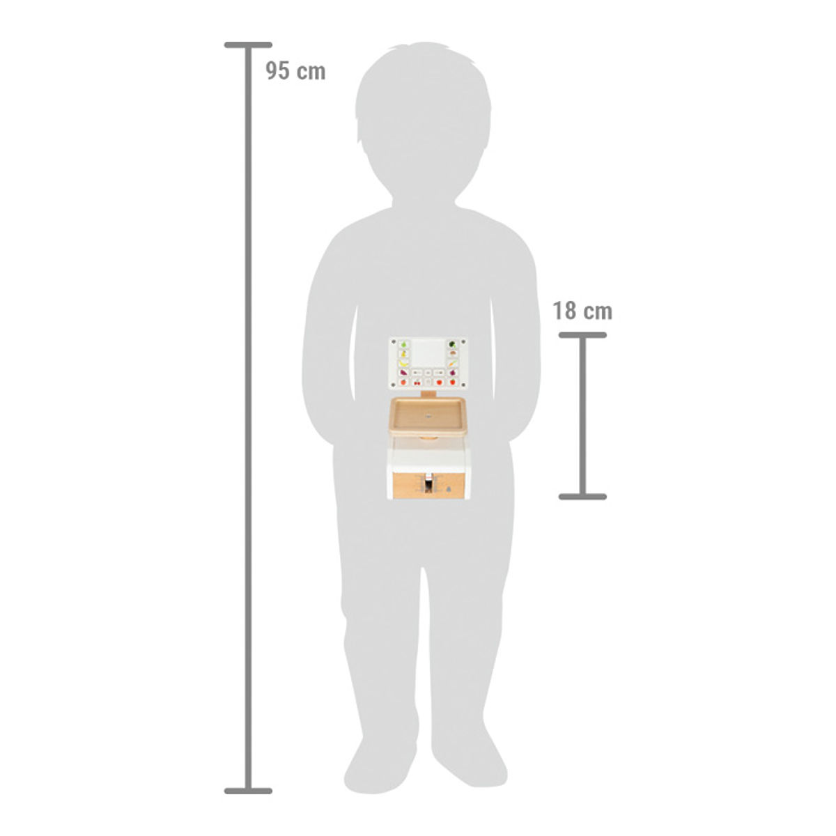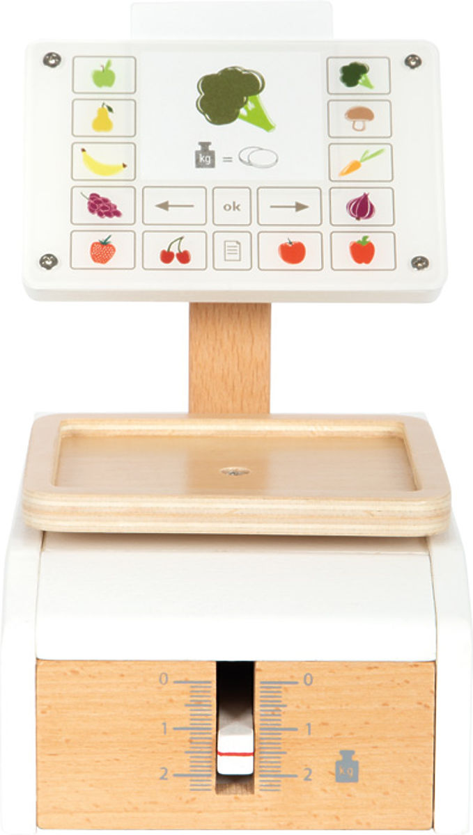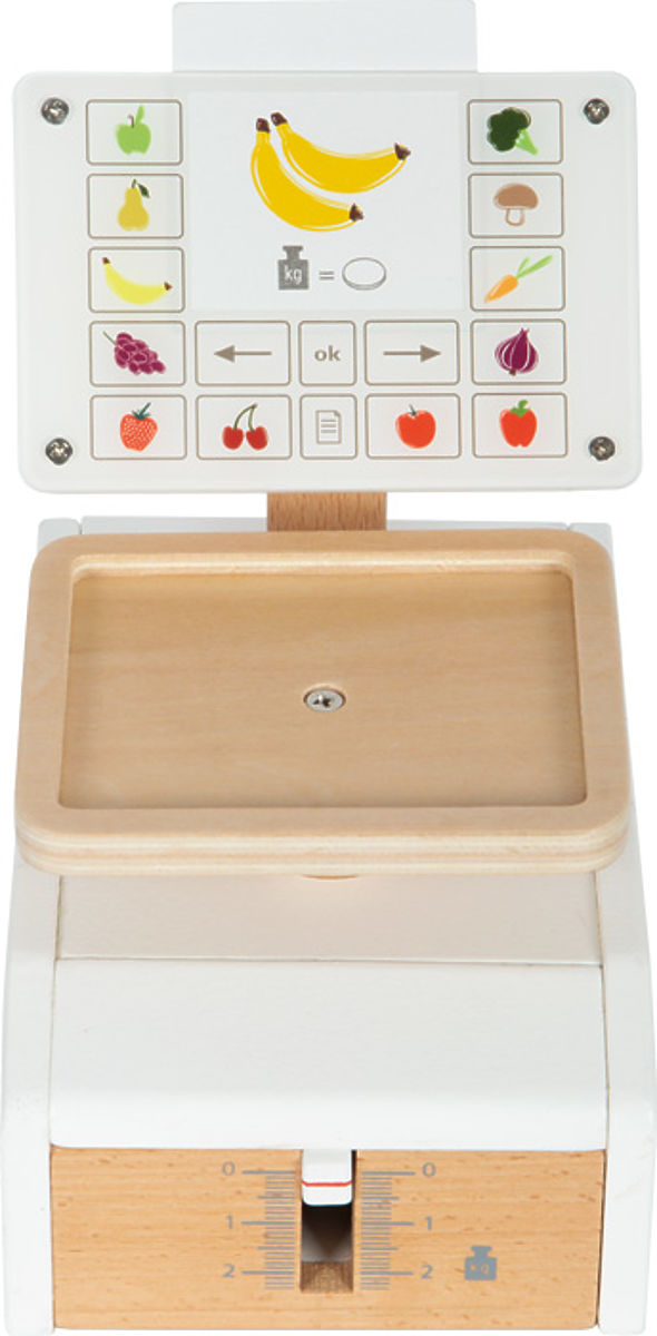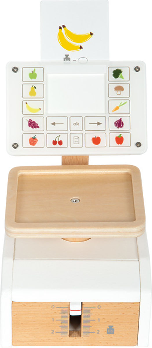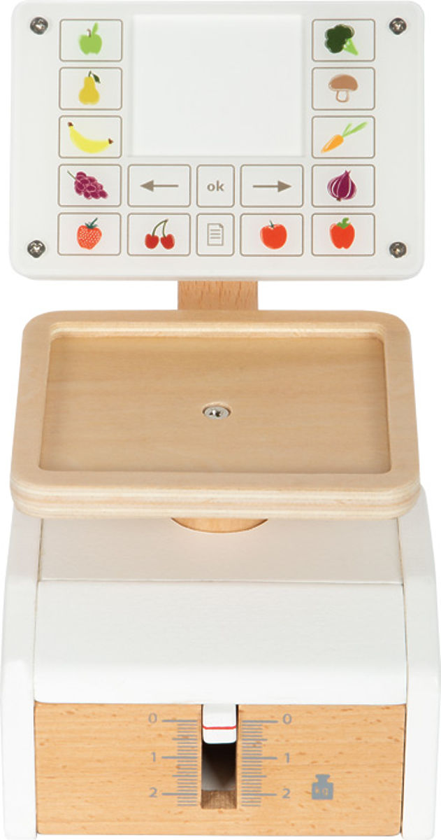 Vážte ovocie a zeleninu ako v supermarkete. Táto drevená váha s veľkou vážiacou plochou je ideálnym doplnkom pre váženie hracích potravín v obchode alebo v detskej kuchynke. Integrovaný pružinový mechanizmus zabezpečuje obzvlášť realistickú hernú zábavu, pretože pohyblivý ukazovateľ hmotnosti a vážiaca miska sa pohybujú hore a dole, keď je niečo položené na váhu. Veľký displej je vyrobený z vysoko kvalitného akrylátového skla, ktorý je potlačený ovládacími prvkami a obrázkami ovocia a zeleniny. Šesť produktových kariet potlačených na oboch stranách s obrázkami ovocia a zeleniny možno vložiť zhora do strednej oblasti „displeja“. Táto váha z produktovej rady „fresh“ je nevyhnutnosťou v každom dobre zásobenom obchode. Jednoduchá ovládateľnosť a jednoduchý mechanizmus váženia umožňujú deťom intuitívne pochopiť proces merania hmotnosti. Aby deti pochopili rôzne ceny, sú na kartách s jedlom obrázky mincí - čím viac mincí je, tým drahšie je vážené kilo ovocia alebo zeleniny. Vysoko kvalitné spracovanie dreva a akrylátového skla robí z váhy skutočný pútač v detskej izbe, ktorý sľubuje dlhodobú zábavu. Manipulácia s váhou trénuje tiež jemnú motoriku a koordináciu ruky a oka. Hlavné vlastnosti: váha s extra veľkou vážiacou miskou, 6 produktových kariet potlačených na oboch stranách, funkčný mechanizmus, pohyblivý ukazovateľ hmotnosti, rozvíja základné matematické a konceptuálne zručnosti, ako je počítanie a porovnávanie hmotnosti, produktová rada „fresh“