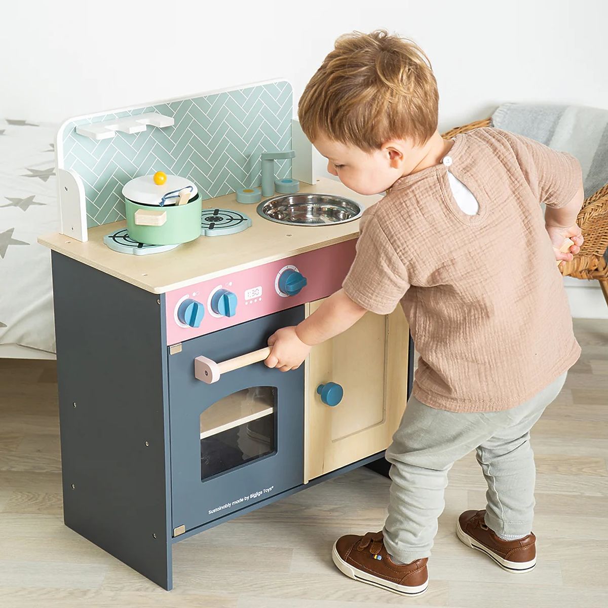 Detská kuchynka, v ktorej môžu deti pripraviť predstierané raňajky do postele pre svojich rodičov. Vyzerá ako skutočná a nájdete v nej sporák, rúru, skrinku pod drezom, drevený hrniec a panvicu, tiež naberačku a varešku. Malí šéfkuchári a šéfkuchárky si užijú predstieranú hru, môžu variť aj pre svoje plyšáky alebo kamarátov. Štýlová drevená kuchynka v tlmených farbách sa bude vynímať v každej izbe. Doplníte ju dreveným jedlom z našej ponuky. Vyrobené z eticky získaného a udržateľného dreva s certifikáciou FSC®, maľované netoxickými farbami a lakmi. Zodpovedá európskym bezpečnostným štandardom. Hlavné vlastnosti: predstieraná hračka, hrniec s pokrievkou, panvica, naberačka, vareška, vyrobené z FSC® certifikovaného dreva, 60 x 55 x 29,5 cm, vhodné od 3 rokov. Značka a certifikát FSC® (Forest Stewardship Council) zaručuje, že drevo, z ktorého bol produkt vyrobený, nebolo ťažené nelegálne a pochádza z lesov obhospodarovaných šetrným či prírode blízkym spôsobom, v ktorom sú dodržiavané prísne environmentálne a sociálne požiadavky. Značka FSC® na výrobku znamená, že svojím nákupom pomáhate chrániť lesy a podporujete šetrné, zodpovedné či prírode blízke hospodárenie, vďaka ktorému sú naše lesy stabilnejšie, zdravšie, majú prirodzenú druhovú skladbu a lepšie odolávajú negatívnym následkom klimatických zmien.