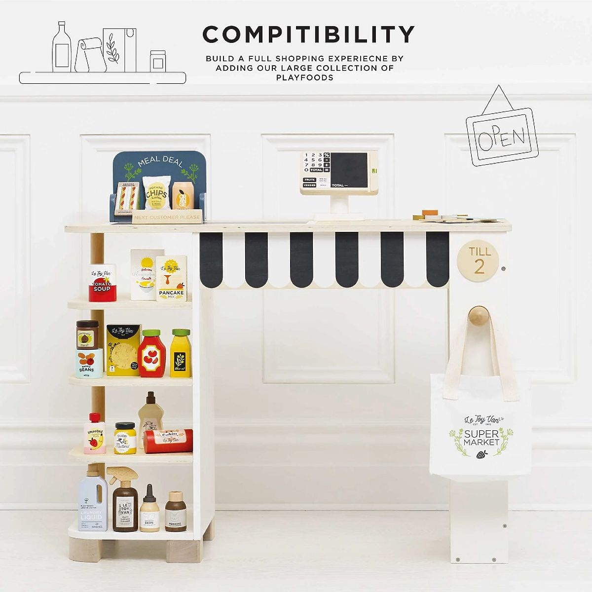 Tento predajný stánok má všetko, čo si len môžete priať, aby ste si v pohodlí domova vytvorili perfektný nákupný zážitok. Súčasťou je regál, na ktorý možno umiestniť rôzne potraviny. Dodáva sa s kompletnou sadou realistických potravín obsahujúcou napr. osviežujúcu plechovku nápoja, sáčok lupienkov, kečup, horčicu, cestoviny...čo sľubuje autentický zážitok z nakupovania pre všetkých, ktorí radi nakupujú. Aby bol zážitok ešte zaujímavejší, je tu navyše elegantná pokladnica, ďalej popisovacia tabuľa, pásový dopravník, skener, hracie peniaze, nápis "ďalší zákazník", kriedová tabuľa so špeciálnou ponukou, bavlnená "taška na celý život" a platobné, odmeňovacie a vernostné karty. Všetky diely sú vyrobené z udržateľných materiálov, vrátane dreva s certifikáciou FSC a prírodnej bavlny. Sada je 100% bez plastu. Hračky s účelom Všetky hračky firmy Le Toy Van sú vyrobené s cieľom – aby dlho vydržali. Dizajnované s láskou skúsenými remeselníkmi za použitia etických praktík a udržateľných materiálov, ktoré sú láskavejšie k našej planéte. Hlavné vlastnosti: multifunkčné, rôznorodé využitie rozvíja komunikačné a sociálne zručnosti detí vyrobené z dreva s certifikáciou FSC® vrátane bohatého príslušenstva 100% bez plastu Značka a certifikát FSC® (Forest Stewardship Council) zaručuje, že drevo, z ktorého bol produkt vyrobený, nebolo vyťažené nelegálne a pochádza z lesov obhospodarovaných šetrným či prírode blízkym spôsobom, v ktorom sú dodržiavané prísne environmentálne a sociálne požiadavky. Značka FSC® na výrobku znamená, že svojím nákupom pomáhate chrániť lesy a podporujete šetrné, zodpovedné či prírode blízke hospodárenie, vďaka ktorému sú naše lesy stabilnejšie, zdravšie, majú prirodzenú druhovú skladbu a lepšie odolávajú negatívnym následkom klimatických zmien. Honeybake kolekcia: Hračky v tejto kolekcii sú vhodné na objavovanie, pomôžu deťom s rozvojom predstavivosti, sociálnych a verbálnych zručností a kognitívnych funkcií. Tradičný dizajn s modernými detailmi deti určite bude baviť. Honeybake je kolekcia Le Toy Van, ktorá vyhrala najviac ocenení, a to za dizajn, kvalitu, bezpečnosť a tiež za vzdelávaciu a hernú hodnotu.