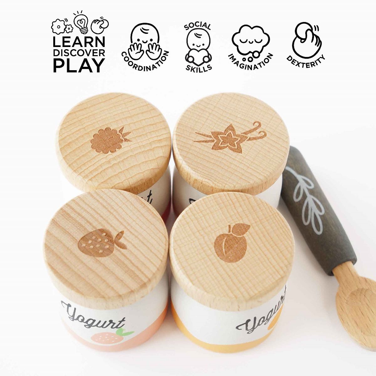 Drevená sada jogurtov s príchuťami a lyžičkou pre deti. .. viac