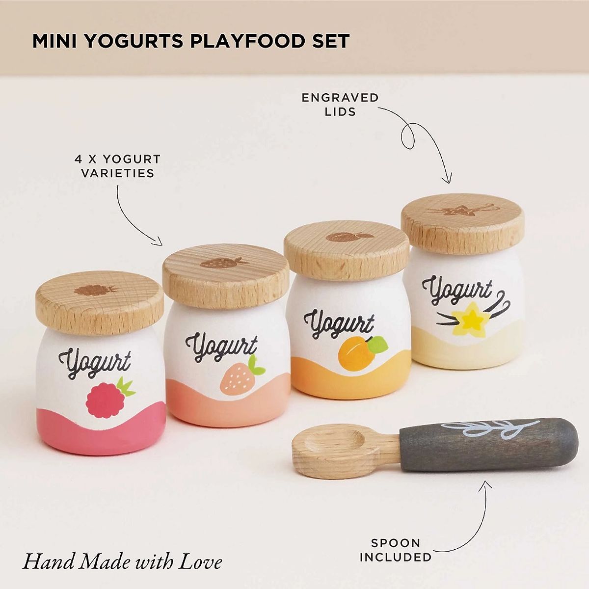 Zdravý začiatok každého dňa! Drevené hracie jedlo je skvelým spôsobom, ako deti oboznámiť s dôležitosťou zdravej a vyváženej stravy. Táto sada obsahuje štyri drevené makety jogurtov s príchuťou broskyne, vanilky, maliny, jahody a jednu drevenú lyžičku. Sada je vhodná aj ako darček. Podporuje rozvoj sociálnych zručností, inšpiruje k nápaditej hre a pomáha zdokonaľovať jemnú motoriku. Vyrobené z dreva s certifikáciou FSC® (z lesov obhospodarovaných udržateľným spôsobom), dekorované netoxickými farbami na báze vody, ktoré sú bezpečné pre deti. Hračky s účelom Všetky hračky firmy Le Toy Van sú vyrobené s cieľom – aby dlho vydržali. Dizajnované s láskou skúsenými remeselníkmi za použitia etických praktík a udržateľných materiálov, ktoré sú šetrnejšie k našej planéte. Hlavné vlastnosti: vyrobené z dreva s certifikátom FSC® maľované netoxickými farbami na báze vody testované podľa najprísnejších štandardov obsahuje 4 jogurty a jednu lyžičku hračka bez plastov Značka a certifikát FSC® (Forest Stewardship Council) zaručuje, že drevo, z ktorého bol produkt vyrobený, nebolo vyťažené nelegálne a pochádza z lesov obhospodarovaných šetrným či prírode blízkym spôsobom, v ktorom sú dodržiavané prísne environmentálne a sociálne požiadavky. Značka FSC® na výrobku znamená, že svojím nákupom pomáhate chrániť lesy a podporujete šetrné, zodpovedné či prírode blízke hospodárenie, vďaka ktorému sú naše lesy stabilnejšie, zdravšie, majú prirodzenú druhovú skladbu a lepšie odolávajú negatívnym následkom klimatických zmien.