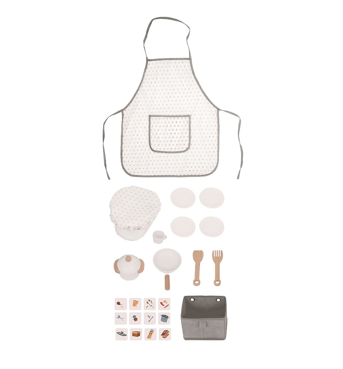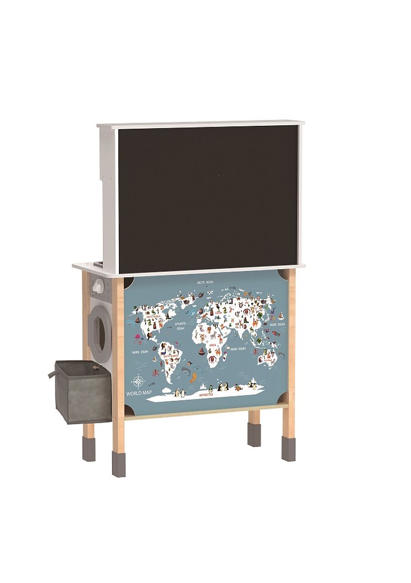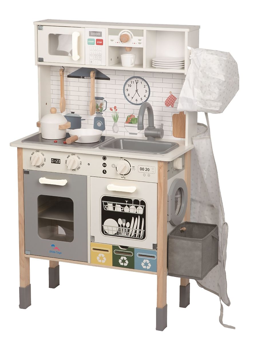 Máte chuť na čerstvý koláčik priamo z pece? Alebo snáď máte zálusk na niečo vyprážané? S touto kuchynkou môžete mať menu, aké sa vám zapáči. Je totiž plne vybavená! Nájdete tu všetko, čo v žiadnej modernej kuchyni nesmie chýbať - sporák s rúrou, umývačku, mikrovlnku, drez, kávovar a samozrejme riad s náčiním, ako sú taniere, hrniec, panvica, hrnček a ďalšie. Na bočnej strane kuchynky je umiestnená práčka, z ktorej je možné vyprané prádlo uložiť do zaveseného odnímateľného košíka. Ani zadná strana kuchynky nezostala nevyužitá. Na praktickú čiernu tabuľu môžu deti napísať odkaz, spísať suroviny receptov alebo niečo nakresliť. Ako inšpirácia im môže poslúžiť zábavná mapa so zvieratkami, ktorá je tiež zozadu. Tak si nasaďte kuchársku čiapku, oblečte praktickú zásteru a môžete začať variť. Keďže nám záleží na planéte Zem, nesmieme tiež zabudnúť na koše na triedenie! Hlavné vlastnosti: súčasťou je bohaté príslušenstvo, multifunkčné, rozmanité využitie, rozvíja komunikačné a sociálne zručnosti, vyrobené z dreva s certifikáciou FSC®. Značka a certifikát FSC® (Forest Stewardship Council) zaručuje, že drevo, z ktorého bol produkt vyrobený, nebolo vyťažené nelegálne a pochádza z lesov obhospodarovaných šetrným či prírode blízkym spôsobom, v ktorom sú dodržiavané prísne environmentálne a sociálne požiadavky. Značka FSC® na výrobku znamená, že svojím nákupom pomáhate chrániť lesy a podporujete šetrné, zodpovedné či prírode blízke hospodárenie, vďaka ktorému sú naše lesy stabilnejšie, zdravšie, majú prirodzenú druhovú skladbu a lepšie odolávajú negatívnym následkom klimatických zmien.