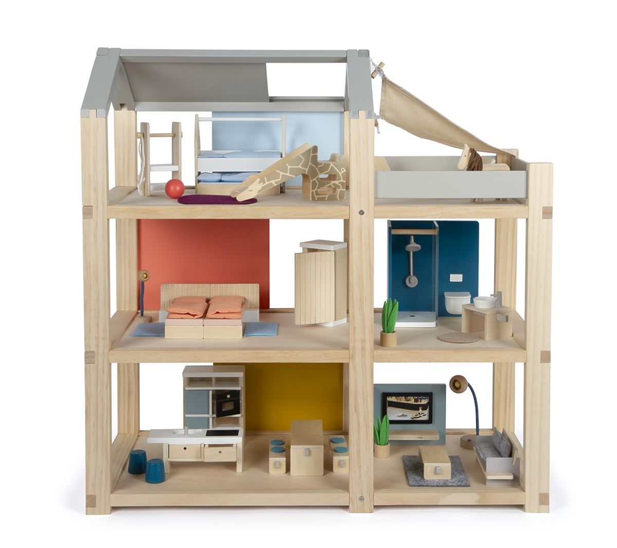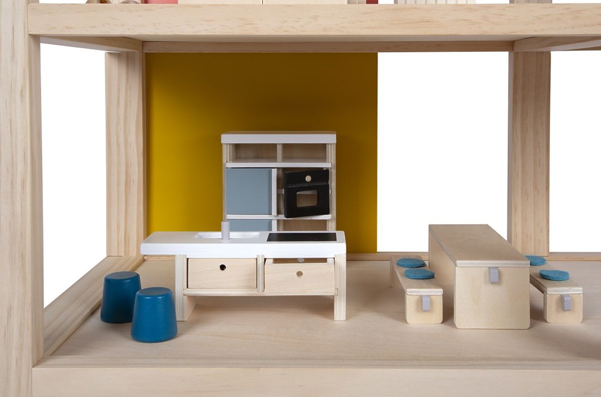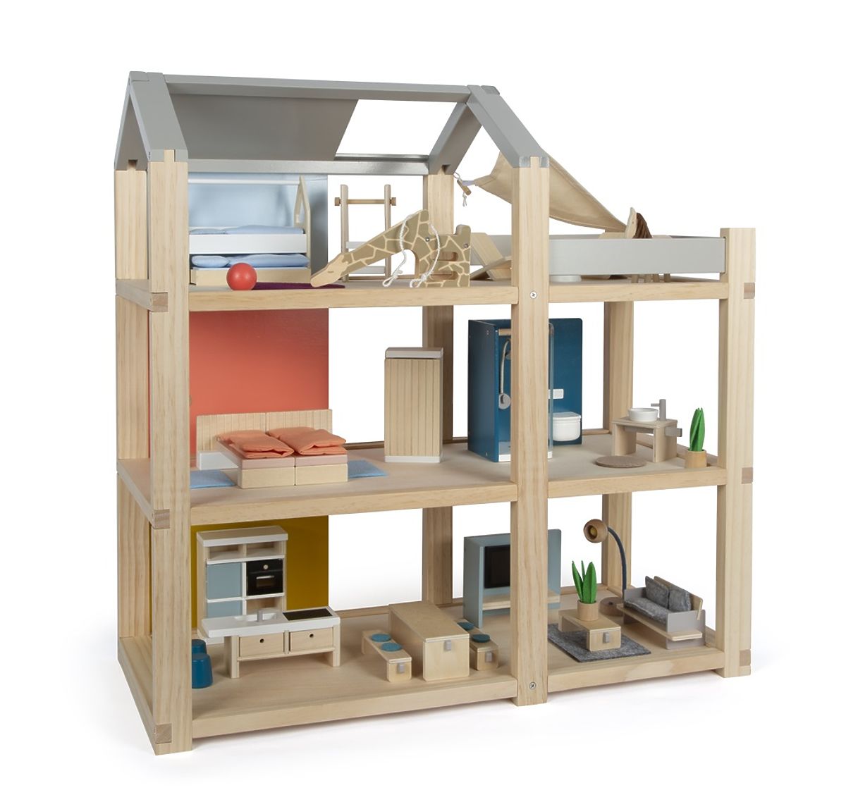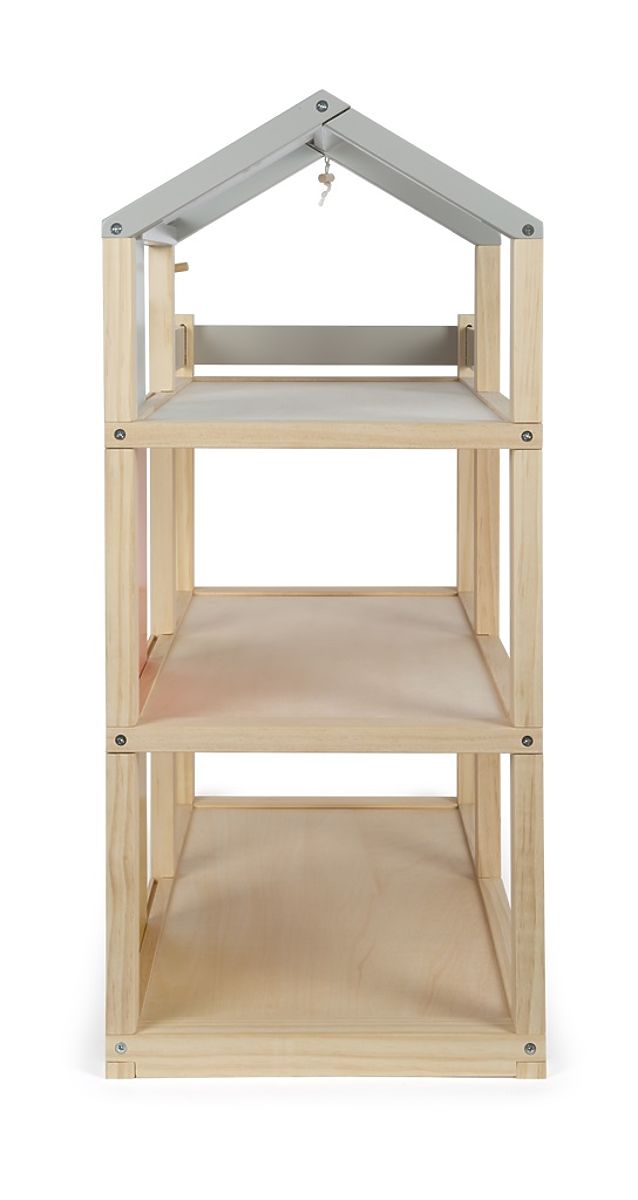 Tento veľký drevený domček pre bábiky v škandinávskom štýle s tromi podlažiami a priestrannou strešnou terasou sa stane nielen zábavnou a kreatívnou hračkou, ale aj interiérovým doplnkom, ktorý vynikne v každej izbičke. Domček má tri podlažia. Skladá sa z útulnej spálne, detskej izby so žirafou šmykľavkou, štýlovej kúpeľne, modernej kuchyne, očarujúcej jedálne, útulnej obývačky, priestrannej strešnej terasy a je kompletne zariadený detailne prepracovaným nábytkom pre bábiky. Vďaka posuvným zadným stenám je možné znovu a znovu meniť vzhľad interiéru. Steny sú totiž obojstranne použiteľné, z jednej strany majú vzhľad prírodného dreva, z druhej strany sú opatrené farebným náterom. Domček je ihneď pripravený na hru – nie je už potrebné žiadne ďalšie príslušenstvo. Hlavné vlastnosti: pre bábiky 12 cmpriestranné izby a veľká strešná terasaplné vybavenie nábytkomotvorená predná stena uľahčuje hru zábavná a kreatívna hračkavkusný interiérový doplnokpodporuje kreativitu a zlepšuje priestorové vnímaniepodporuje rozvoj motorických, rečových a sociálnych zručností