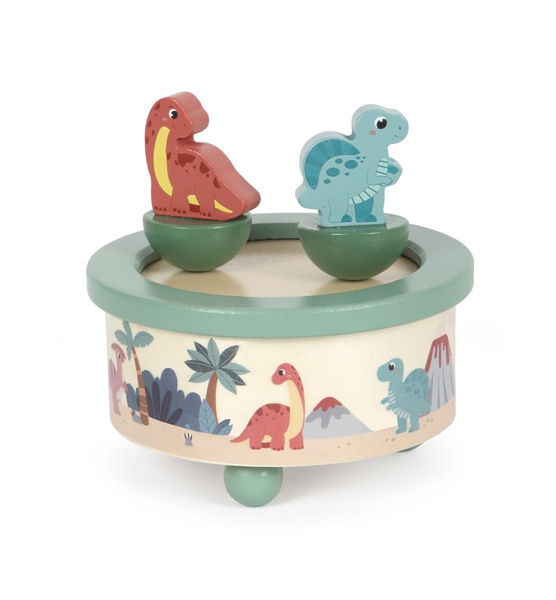 Klasická hracia skrinka s motívom dinosaurov je vyrobená zo 100% FSC® dreva. Jej jemné farby a roztomilé dinosaury spolu s príjemnou melódiou Carousel Waltz Richarda Rodgerse upútajú pozornosť každého dieťaťa. Vďaka kvalitným farbám a modernému dizajnu bude hracia skrinka vkusnou dekoráciou do detskej izby. Dvaja dinosaury držia na hornej strane hracej skrinky pomocou magnetov a točia sa do rytmu hudby. Dajú sa jednoducho oddeliť, a tak si s nimi môžu deti pohrať aj zvlášť. S hračkami z produktovej rady "Dino" sú témou fascinujúci prehistorickí tvorovia, ktorí upútajú pozornosť ľudí všetkých vekových kategórií. Tieto drevené hračky podporujú rozvoj motorických zručností, inšpirujú detskú kreativitu a predstavivosť a povzbudzujú deti, aby sa dozvedeli viac o prírode a histórii týchto pravekých obrov. Hlavné vlastnosti: jednoduché ovládanie, odnímateľné figúrky, rozvíja predstavivosť, podporuje lásku k hudbe, roztomilé detaily. Značka a certifikát FSC® (Forest Stewardship Council) zaručuje, že drevo, z ktorého bol produkt vyrobený, nebolo ťažené nelegálne a pochádza z lesov obhospodarovaných šetrným či prírode blízkym spôsobom, v ktorom sú dodržiavané prísne environmentálne a sociálne požiadavky. Značka FSC® na výrobku znamená, že svojím nákupom pomáhate chrániť lesy a podporujete šetrné, zodpovedné či prírode blízke hospodárenie, vďaka ktorému sú naše lesy stabilnejšie, zdravšie, majú prirodzenú druhovú skladbu a lepšie odolávajú negatívnym následkom klimatických zmien.
