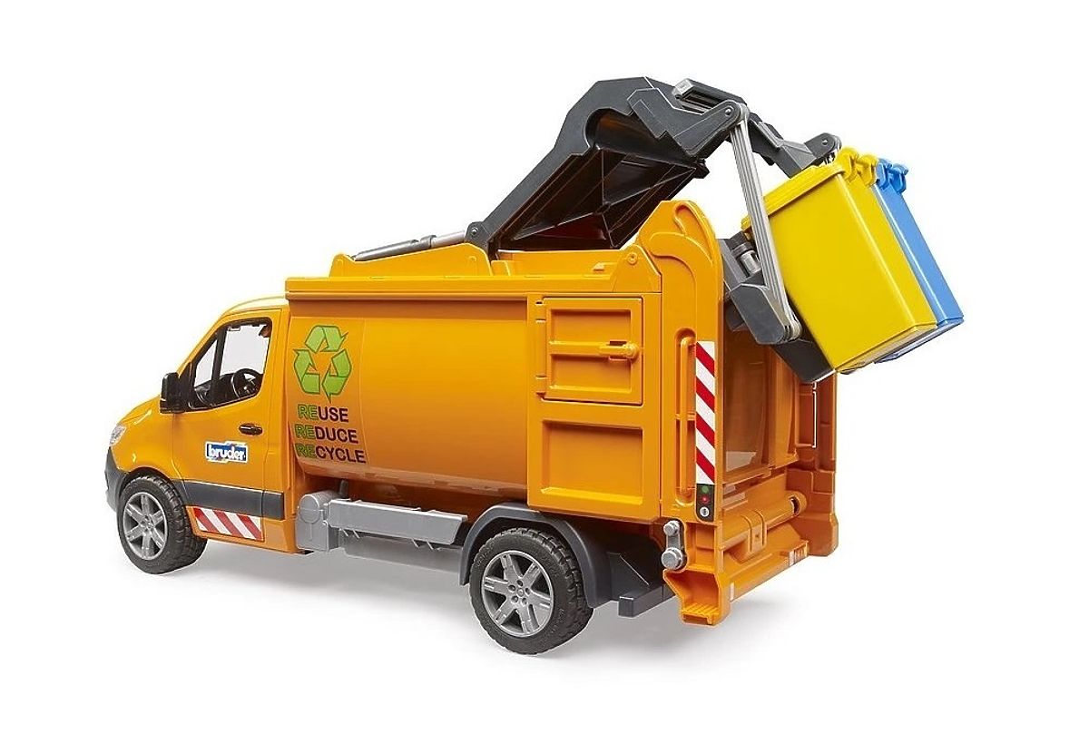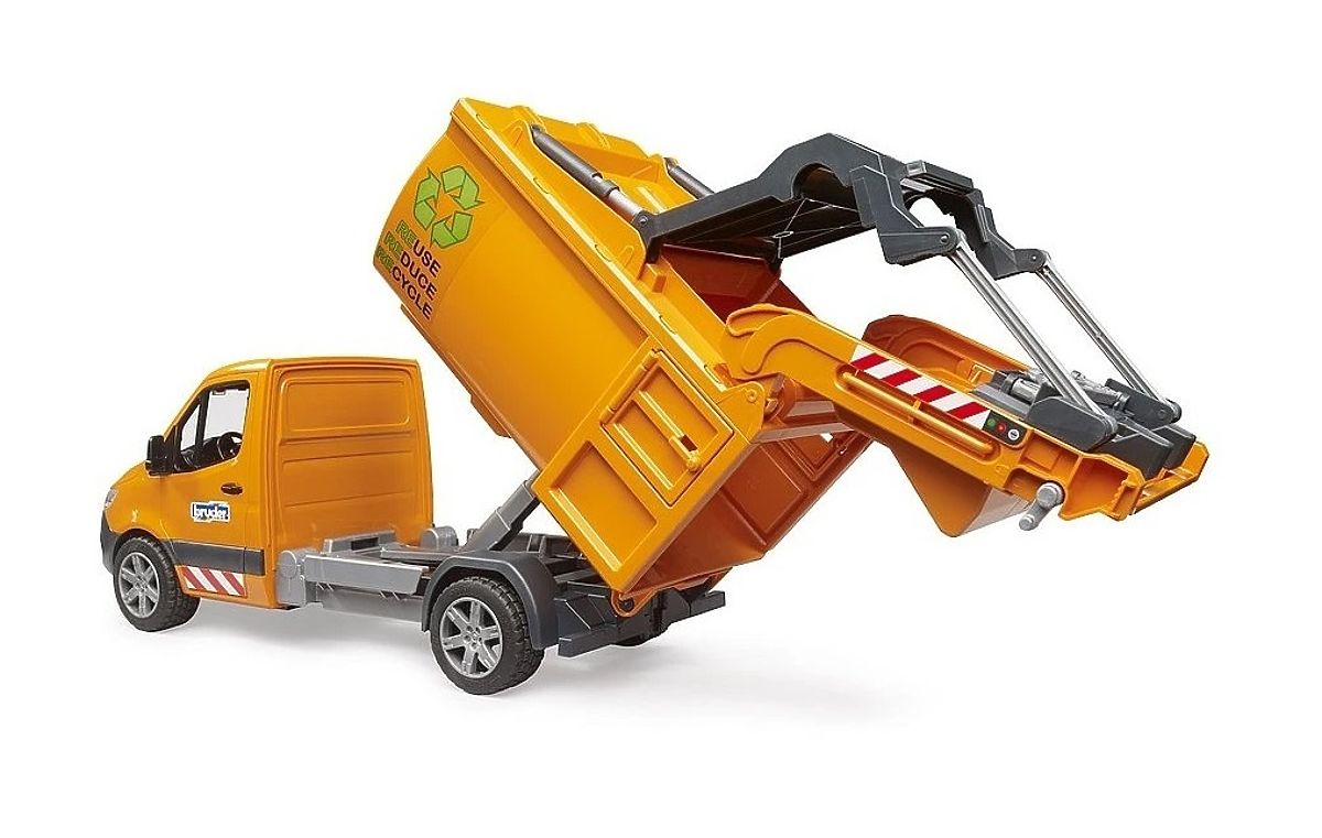Efektívny a spoľahlivý, takto Mercedes Benz opisuje nový Sprinter, ktorý teraz prichádza, aby rozšíril škálu smetiarskych vozidiel značky Bruder. Existuje mnoho miest, kam sa veľké smetiarske auto nedostane, ale s touto novinkou nezostane žiadne miesto bez odvozu odpadu. Rovnako ako skutočné smetiarske vozidlo, aj tento model mestského smetiarskeho vozidla si poradí s malými smetiakmi či kontajnermi alebo nádobami na odpadky. Na vrecia na odpadky a zabudnuté odpadky sú dve bočné klopy. Pri vyprázdňovaní smetiakov alebo kontajnerov sa po zdvihnutí smetiakov za účelom vyprázdnenia automaticky otvorí záklopka stropného vozidla. Po vyprázdnení a spustení smetiakov sa klapka opäť uzavrie. Vozidlo sa vyprázdni odomknutím a otvorením zadných výklopných dverí a vyklopením karosérie vozidla. Hlavné vlastnosti: otváracie dvere, okná z priehľadného a tvrdeného plastu, vyklápacia korba, profilové pneumatiky, 2 smetiaky, vyrobené z vysoko kvalitných ABS plastov, kompatibilné s figúrkami BWORLD, vyrobené v Nemecku
