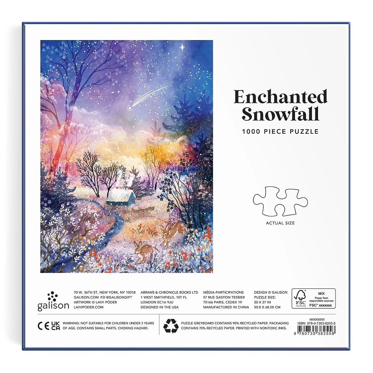 Čarovná zasnežená krajina 1000-dielikové puzzle od firmy Galison zobrazuje zasneženú zimnú krajinu osvetlenú nadprirodzenou, hviezdnou oblohou. Toto puzzle predstavuje nádhernú hviezdnu oblohu nad malou chalúpkou obklopenou krásou zimy a samozrejme čarom snehu, všetko v živých farbách. Autorkou obrázku je ilustrátorka Laivi Põder. Jej tvorba je známa pre pokojné a snové atmosféry. Puzzle sú vyrobené za použitia významného podielu recyklovaného papiera a ponúkajú špičkovú tlač nezávadnými farbami. Sú opatrené matnou povrchovou úpravou, ktorá zaisťuje za všetkých okolností verné podanie detailov aj farieb. Ich zadná strana je potiahnutá hladkým, na dotyk príjemným povrchom, vďaka ktorému sa pri skladovaní rozloženého puzzle netvorí prach. Spolu s dôkladne zabalenými dielikmi nájdete v balení aj letáčik s návodným obrázkom. Dodávané v mimoriadne pevnej a pútavo spracovanej kartónovej krabičke vyrobenej z recyklovaného kartónu a udržateľne získaných materiálov s certifikáciou FSC®. Hlavné vlastnosti: 1000 precízne vyrezaných dielikov vyrobené s použitím recyklovaných a udržateľne získaných materiálov dôkladne vybraný motív od renomovaných tvorcov a umelcov tlač a prevedenie najvyššej kvality obsahuje návodný obrázok Značka a certifikát FSC® (Forest Stewardship Council) zaručuje, že drevo, z ktorého bol produkt vyrobený, nebolo vyťažené nelegálne a pochádza z lesov obhospodarovaných šetrným či prírode blízkym spôsobom, v ktorom sú dodržiavané prísne environmentálne a sociálne požiadavky. Značka FSC® na výrobku znamená, že svojím nákupom pomáhate chrániť lesy a podporujete šetrné, zodpovedné či prírode blízke hospodárenie, vďaka ktorému sú naše lesy stabilnejšie, zdravšie, majú prirodzenú druhovú skladbu a lepšie odolávajú negatívnym následkom klimatických zmien.