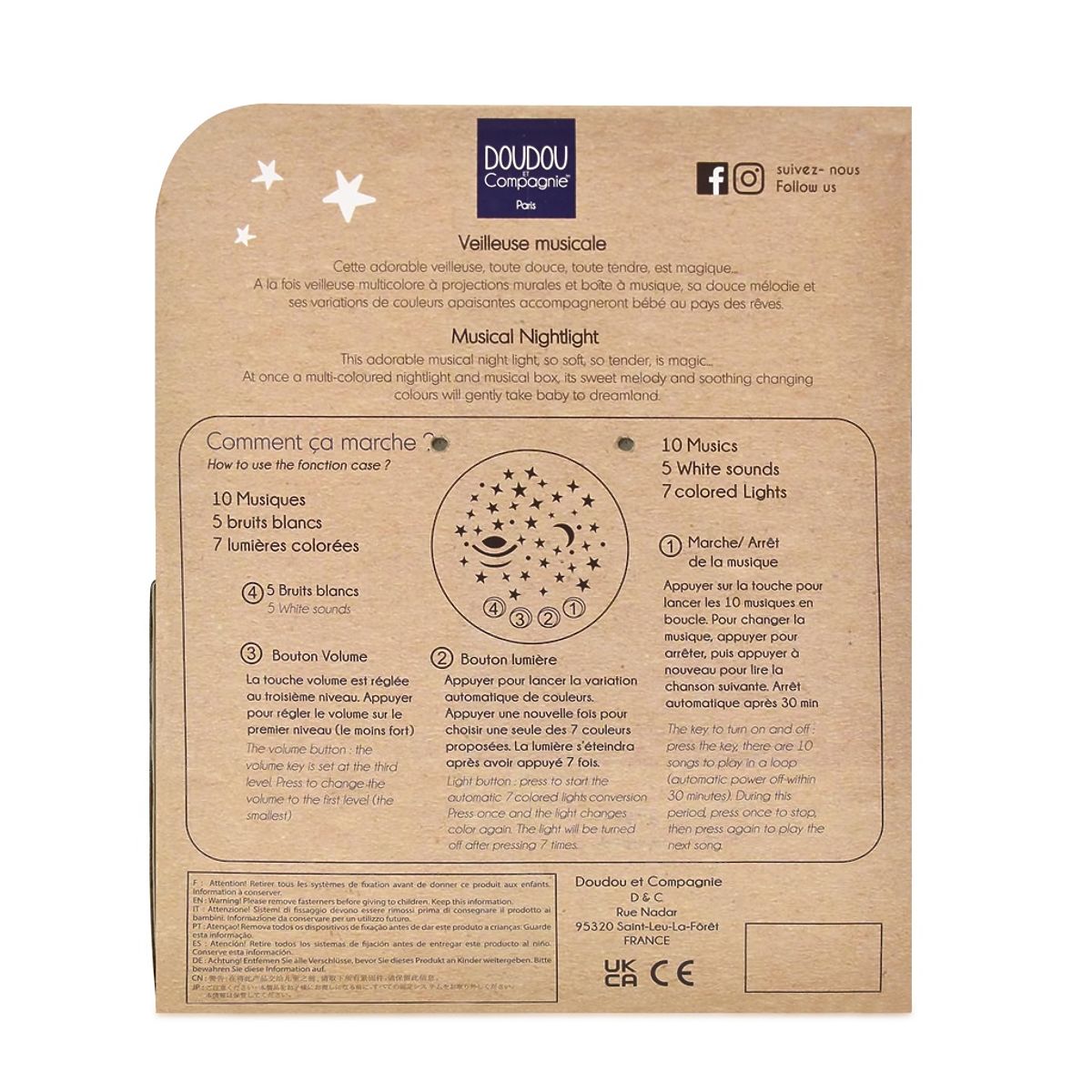 Ktože tu ešte nespí? Vďaka tomuto roztomilému zajačikovi bude uspávanie vášho dieťatka hračkou. Zajačik z jemného materiálu je vhodný na maznanie a na brušku má hraciu skrinku s projekciou vesmíru v 7 farbách. Prehráva 10 jemných melódií a 5 upokojujúcich zvukov, ktoré ukolíšu vaše bábätko a podporia jeho relaxáciu a kvalitný spánok. Pomocou 4 tlačidiel je možné nastaviť hlasitosť a rôzne režimy prehrávania melódií a jednotlivé farebné režimy. Na výber je automatický režim, kedy sa melódie prehrávajú opakovane alebo je možné zvoliť konkrétnu skladbu. Rovnako tak môžete nastaviť automatický režim svetla, kedy sa budú farby plynulo meniť alebo vybrať vašu obľúbenú farbu. Vizuálna a sluchová stimulácia pomáha zmyslovému rozvoju dieťaťa. Táto hracia skrinka s projekciou je krásnym darčekom pre každé dieťa už od narodenia. ÚdržbaZajačika perte v kúpeli na 30° (pred praním vyberte hrací strojček). Sušte prirodzene alebo pri nízkej teplote. Hlavné vlastnosti: plyšová hračka a hracia skrinka s projekciou v jednomhracia skrinka je odnímateľná pre ľahkú údržbuvizuálna a zmyslová stimuláciamäkký plyšv súlade s európskymi normami CEvhodné ako darček alebo doplnok do detskej izbyk napájaniu slúžia 3 batérie AAA/R03 (nie sú súčasťou balenia)od narodenia