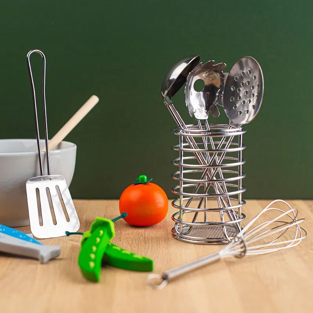 Pomocou sady kuchynského náradia bude varenie a pečenie hračkou! Sada určená pre malých kuchárov a kuchárky obsahuje šesť náradí pre deti vrátane obracačky, dierovanej lyžice, naberačky, šľahacej metly, naberačky na špagety a varešky, uložené v praktickej valcovej nádobe. Deti môžu šľahať, miešať a servírovať a vyskúšajú si rôzne kuchynské činnosti a podporia tak svoju kreativitu. Hranie na role je skvelý spôsob, ako rozvíjať sociálnu inteligenciu, jazykové schopnosti, kreatívne myslenie a komunikačné zručnosti. Manipulácia s kuchynským náradím zlepšuje jemnú motoriku a koordináciu ruka-oko. Náradie je vyrobené z prvotriednych kvalitných materiálov z odpovedných zdrojov a natreté netoxickými farbami a lakmi. Spĺňa aktuálne európske bezpečnostné normy. Hlavné vlastnosti: 6 ks kuchynského náradia v nádobe: obracačka, dierovaná lyžica, naberačka, šľahacia metla, naberačka na špagety a vareška rozvíja sociálnu inteligenciu, jazykové schopnosti, kreatívne myslenie a komunikačné zručnosti zlepšuje jemnú motoriku a koordináciu ruka-oko podporuje hranie na role vyrobené z vysoko kvalitných materiálov vhodné od 3 rokov veku