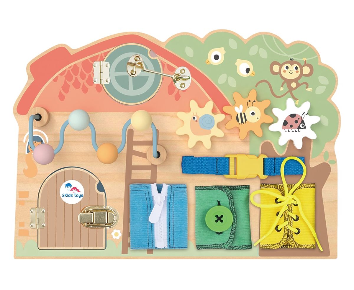 Od zámku po šnúrky! Táto hracia doska s obrázkami zvieratiek prináša množstvo zábavy, vďaka ktorej môže vaše dieťa rozvíjať svoju zručnosť, zvedavosť a najmä jemnú motoriku. Zámky, labyrint, zips, šnúrky a ďalšie aktivity dávajú dieťaťu možnosť precvičovať rôzne viazania, spájania, otáčania či otvárania a pripraviť sa tak na úkony každodenného života. Hracia doska je vyrobená z dreva s certifikáciou FSC®. Hlavné vlastnosti: podporuje nezávislosť, jemnú motoriku a koordináciu ruka-oko, podnecuje kreatívne myslenie a predstavivosť, senzorická stimulácia, edukácia cez hru, vyrobené z dreva s certifikáciou FSC®. Značka a certifikát FSC® (Forest Stewardship Council) zaručuje, že drevo, z ktorého bol produkt vyrobený, nebolo ťažené nelegálne a pochádza z lesov obhospodarovaných šetrným či prírode blízkym spôsobom, v ktorom sú dodržiavané prísne environmentálne a sociálne požiadavky. Značka FSC® na výrobku znamená, že svojím nákupom pomáhate chrániť lesy a podporujete šetrné, zodpovedné či prírode blízke hospodárenie, vďaka ktorému sú naše lesy stabilnejšie, zdravšie, majú prirodzenú druhovú skladbu a lepšie odolávajú negatívnym následkom klimatických zmien.