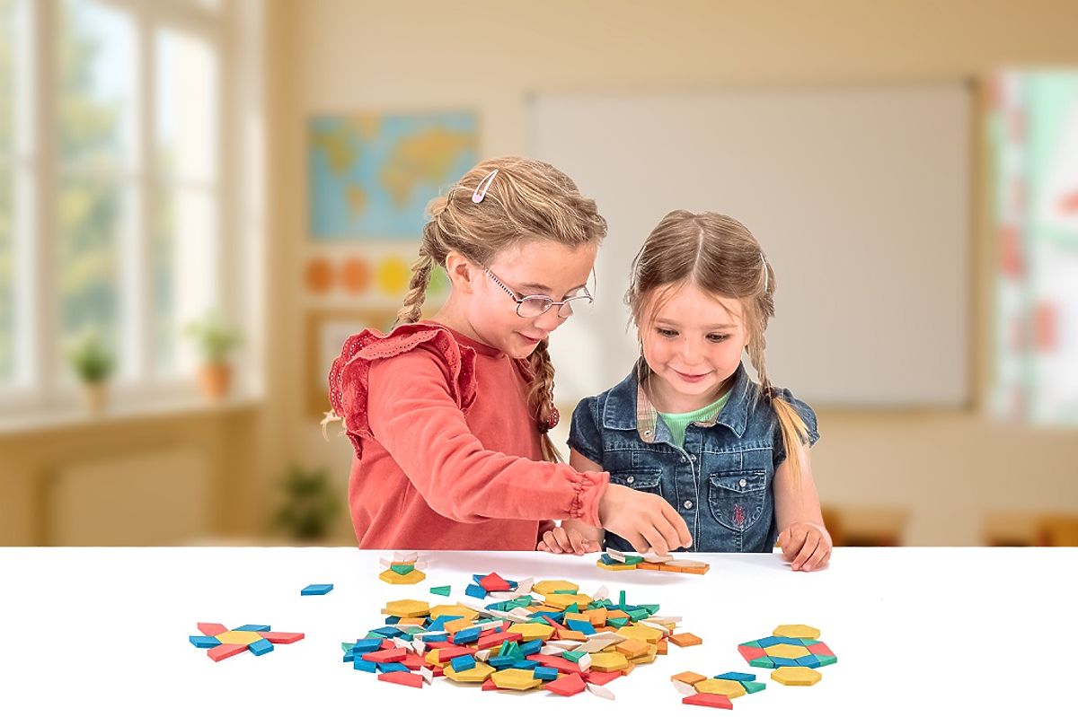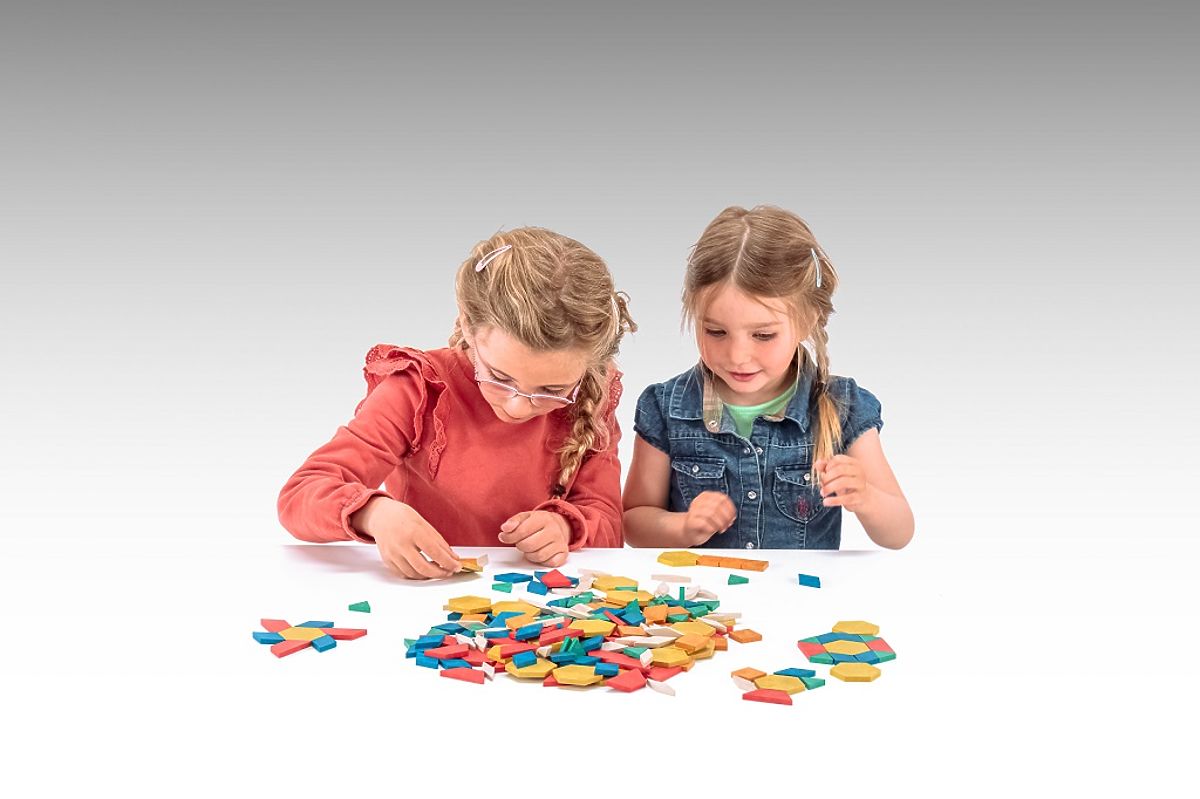 250 ks farebných dielikov v 6 geometrických tvaroch, ktoré slúžia na hranie aj učenie sa o tvaroch a farbách. Zapojte svoju kreativitu a zložte si 3D obrázky. Ozdoby, zvieratá, čísla, ornamenty či mandaly. Dieťa si osvojuje objavovanie symetrie a pomenovávanie rôznych tvarov a povrchov. Balenie obsahuje 25 žltých šesťuholníkov, 25 oranžových štvorcov, 50 červených lichobežníkov, 50 zelených trojuholníkov, 50 modrých rovnobežníkov a 50 béžových kosoštvorcov. Vyrobené zo 100 % recyklovaných materiálov, má certifikáciu PEFC a po použití ho možno opakovane recyklovať. Hlavné vlastnosti: obsahuje 250 dielikovprvé hravé skúsenosti s geometriouobsahuje návod a 20 rôznych možností skladaniavyrobené v Nemecku