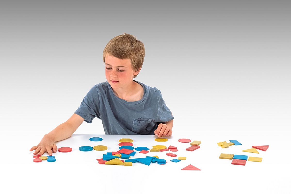 60 kusov drevených geometrických tvarov vyrobených z recyklovaného dreva, ktoré slúžia na hranie aj učenie sa o tvaroch a farbách. 5 rôznych tvarov (štvorec, trojuholník, obdĺžnik, kruh, šesťuholník) v 2 veľkostiach (veľký štvorec 5,5x5,5 cm, malý štvorec 3,2x3,2 cm) v 3 farbách (červená, žltá a modrá) a v 2 hrúbkach (0,2 cm a 0,6 cm). Naučte sa pomenovať a rozlišovať geometrické tvary. Vytvárajte z týchto logických blokov identické vzory, rozpoznávajte ich podľa farby, tvaru, veľkosti alebo hrúbky. Vyrobené zo 100 % recyklovaných materiálov, má certifikáciu PEFC a po použití ho možno opakovane recyklovať. Hlavné vlastnosti: obsahuje 60 dielov, 5 rôznych tvarov, 2 veľkosti, 3 farby, 2 hrúbky, prvé hravé skúsenosti s geometriou, rozpoznávanie tvarov a farieb, tréning pamäťových zručností, vyrobené v Nemecku