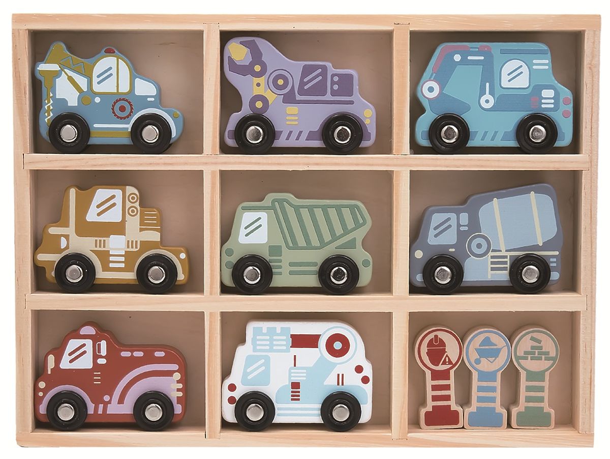 Sada 8 drevených autíčok a 3 značiek v praktickej poličke je skvelým doplnkom detskej izby alebo herne. Obsahuje rôzne vozidlá - cisternu, hasičské a policajné auto, bager a ďalšie, ktoré inšpirujú k predstavivej hre a podnecujú detskú fantáziu. Autíčka sú prispôsobené pre malé detské ruky, ľahko sa uchopujú a dobre sa s nimi manipuluje. Hraním si deti rozvíjajú jemnú motoriku, obratnosť aj koordináciu pohybov. Zároveň si pri vytváraní vlastných príbehov a situácií posilňujú kreatívne myslenie a komunikačné schopnosti. Polička slúži nielen na praktické uskladnenie autíčok, ale aj ako štýlový doplnok, ktorý v detskej izbe pekne vynikne a udrží hračky vždy pekne po ruke. Hlavné vlastnosti: 8 autíčok, 3 značky, polička rozvíja predstavivosť a kreativitu podporuje predstavivú hru rozvíja jemnú motoriku, koordináciu ruka-oko a obratnosť zlepšuje sociálne zručnosti vhodné od 2 rokov