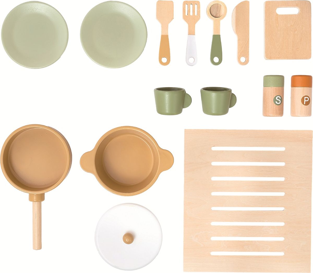 Máte chuť na teplý domáci koláčik? Alebo by ste radšej niečo vyprážané? S touto kuchynkou môžete mať menu podľa vašich predstáv. Je totiž plne vybavená! Nájdete tu všetko, čo v modernej kuchyni nesmie chýbať - sporák s rúrou, výrobník ľadu, mikrovlnku, drez, kávovar a samozrejme riad s náčiním, ako sú taniere, hrniec, panvica, hrnčeky, nôž, naberačka a ďalšie. Vďaka otváracím dvierkam a otočným gombíkom je zážitok z hry ešte realistickejší. Všetko je vyrobené z kvalitného pevného dreva a ošetrené netoxickými farbami. Tak si nasaďte kuchársku čiapku, oblečte zásteru a pustite sa do varenia! Obsah balenia: 2x tanier, 2x hrnček, 1x panvica, 1x hrniec, 1x pokrievka, 1x korenička, 1x soľnička, 1x doska, 4 ks náčinia, rošt do rúry. Hlavné vlastnosti: súčasťou je bohaté príslušenstvo, multifunkčné, rozmanité využitie, rozvíja komunikačné a sociálne zručnosti, motivuje k predstavivej hre, vhodné pre deti do 3 rokov