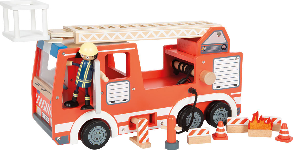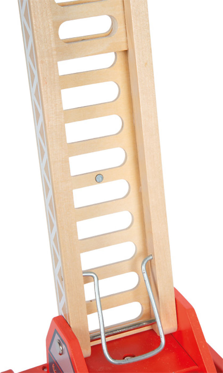 Veľké hasičské auto, ktoré dorazí na miesto čo nevidieť! Navyše zaujme svojimi detailmi a robustným spracovaním. Vysúvací rebrík s košom, ktorý je možné otáčať o 360 stupňov, umožňuje záchranné práce vo vysokých výškach a vďaka magnetu rebrík bezpečne uzamkne na mieste. Vysúvacie podperné nohy poskytujú stabilnú základňu, zatiaľ čo navíjacia hadica s magnetickým systémom a zodpovedajúcim hydrantom je pripravená na akčné hasičské misie. Otváracia strecha poskytuje úložný priestor pre širokú škálu príslušenstva. V kabíne vodiča s pohyblivými dverami je tiež dostatok miesta pre priloženú figúrku hasiča (ohybná bábika s pohyblivými rukami a nohami). Pogumované kolesá zaisťujú tichú a bezpečnú cestu na miesto ďalšej misie. Či už ide o zabezpečenie miest nehôd pomocou bariérových zábran alebo o hasenie požiarov pomocou zasúvacej hadice a rozprašovača vody, táto herná sada ponúka nespočet možností pre kreatívne hranie na tému hasenia požiaru a záchrany. Funkčný a detailný dizajn zaisťuje obzvlášť autentický zážitok z hry. Hlavné vlastnosti: obsahuje 1 hasičské auto s rebríkom a hadicou, 1 ohybnú figúrku, 2 dopravné výstražné kužele, 3 zábrany, 1 vysúvací stojan, 1 hydrant, 1 plstený oheň ideálne pre fanúšikov autíčok a hasičov pevné drevo, zaoblené hrany realistický dizajn do auta sa zmestí figúrka pohyblivý rebrík tiché pogumované kolieska
