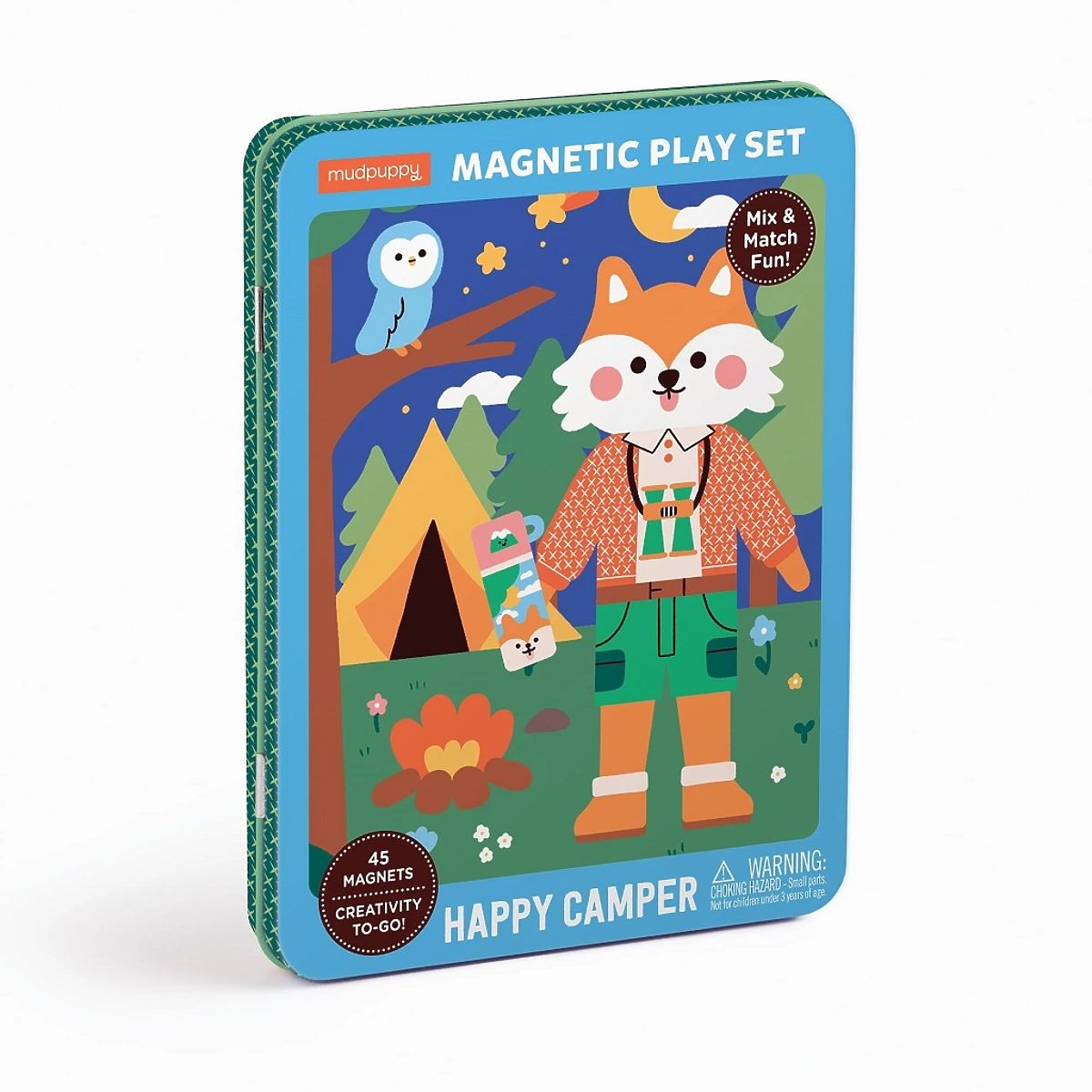 Magnetická sada Šťastný táborník obsahuje 2 ilustrované scény a 3 archy (45ks) rôznych magnetov na obliekanie. Hra ponúka hodiny nápaditého hrania. Obal sa ľahko čistí. Perfektná aj ako cestovná hračka. Hlavné vlastnosti: skvelá cestovná hračka v kovovej krabičke, tlačené netoxickými farbami, 45ks rôznych magnetov, 2 ilustrované scény