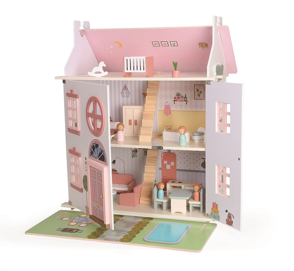 Vitajte v domčeku! Na mieste, kde príbehy čakajú len na Vás. Vďaka trom poschodiam a bohato priestranným izbám je pre Vaše malé bábiky úplne ideálny. Spolu s rodinkou tu nájdete všetko, čo je v modernej domácnosti potrebné – kuchyňu, kúpeľňu, spálňu, obývačku aj detskú izbu v podkroví. Zložte prednú časť strechy, otočte ju a položte pred otvorený domček a hneď máte pre bábiky aj záhradu s bazénom a nábytkom. Tvorte si rodinné príbehy podľa vlastnej fantázie! Pri hraní deti precvičujú komunikačné zručnosti, prehlbujú sociálne interakcie a využívajú kreativitu. Hlavné vlastnosti: obľúbený, tradičný a nadčasový domček, inšpiruje k predstavivej hre, trénuje koordináciu a jemnú motoriku, vrátane príslušenstva a bábik.