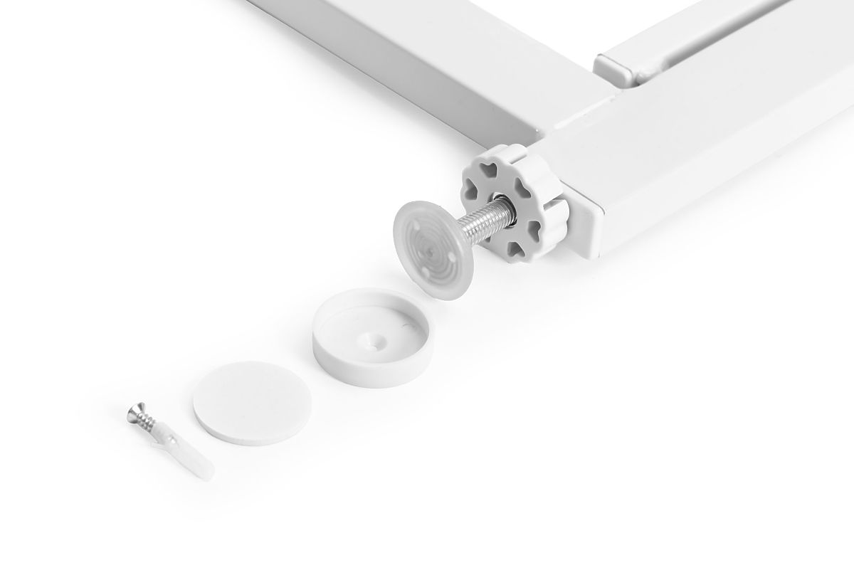 JEDNODUCHÁ MONTÁŽMontáž zábrany je mimoriadne jednoduchá a nevyžaduje použitie žiadnych nástrojov ani vŕtanie otvorov do stien či zárubní. Vďaka 4-bodovému systému upevnenia tlakom zábrana stabilne drží na mieste, bez toho aby spôsobovala poškodenie povrchov. Navyše, priložené ochranné podložky chránia steny a podlahu pred prípadnými škrabancami, zaisťujúce estetický vzhľad miestností.
