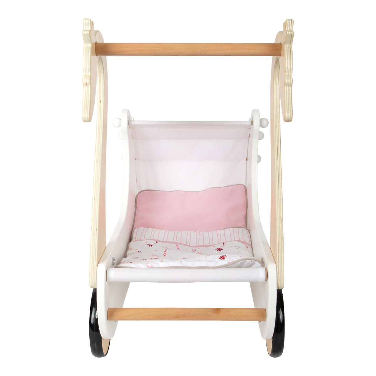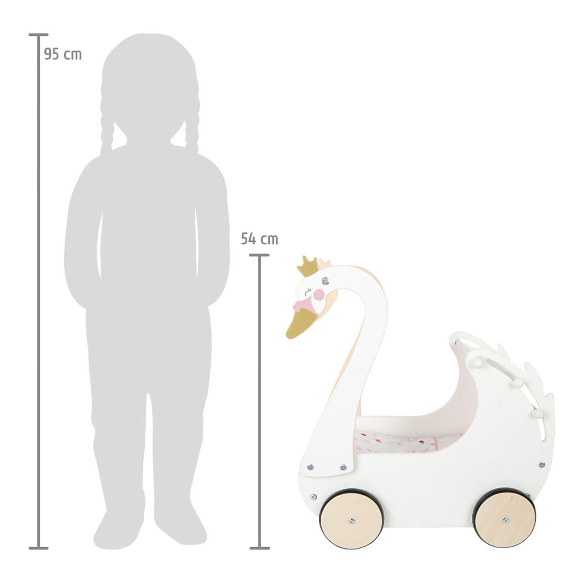 Starajte sa o bábiky s labuťou eleganciou! Nechajte deti rozvíjať fantáziu a sociálne zručnosti. Svojou vytříbenou farebnosťou a jednoduchými tvarmi kočík hravo doplní každú dievčenskú izbu. Pojme aj bábiky nadmerných veľkostí, je vybavený sťahovateľnou látkovou strieškou a dodávaný s kvetovanou ružovo-bielou posteľnou bielizňou. Pogumované kolieska ponúkajú kultivovaný tichý chod na všetkých typoch povrchov a šetria ich. Konštrukcia kombinuje odolnú preglejku a na dotyk obzvlášť príjemné masívne drevo. Výrobok vyžaduje montáž, dodávaný s detailným návodom na zostavenie. Hlavné vlastnosti: kočík vrátane posteľnej bielizne pre bábiky s výškou do 46 cm, sťahovateľná strieška, tichý chod, odolné drevené prevedenie