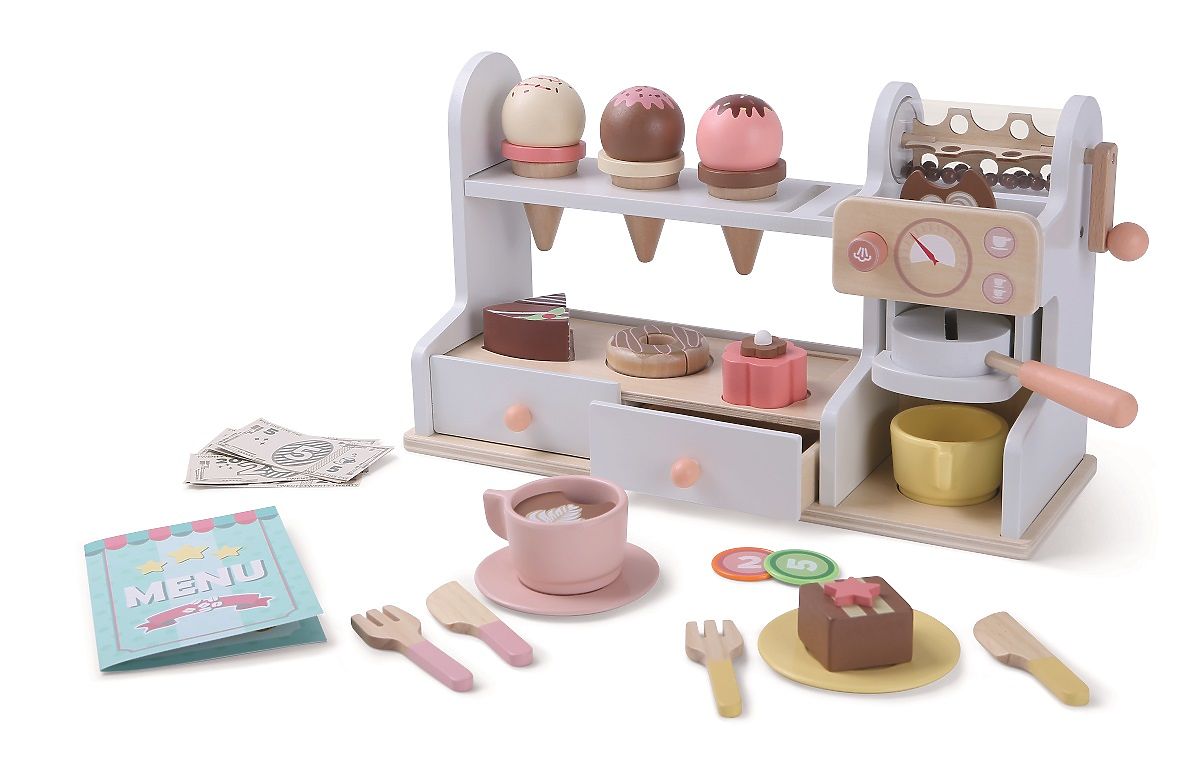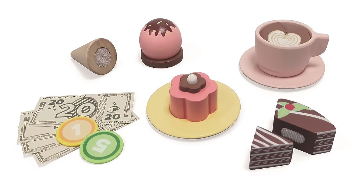 Staň sa skutočným baristom či obchodníkom! Máte chuť na zmrzlinu, koláčik alebo len lahodnú kávu? S touto 46-dielnou sadou si užijete hodiny zábavy. Sada ponúka šálky s podšálkami, príbor a lyžice, pultík s kávovarom, vitrínu s koláčikmi a poličku s otvormi na zmrzliny. Nechýbajú ani zásuvky s úložným priestorom na peniaze, ktoré sú tiež súčasťou tejto sady. Hračky na hranie rolí podnecujú v deťoch fantáziu a inšpirujú ku kreatívnej hre, čo má priaznivý vplyv aj na ich slovnú zásobu a rozvoj jazyka. Hlavné vlastnosti: obsahuje 46 dielov, podporuje rozvoj jazyka a slovnej zásoby