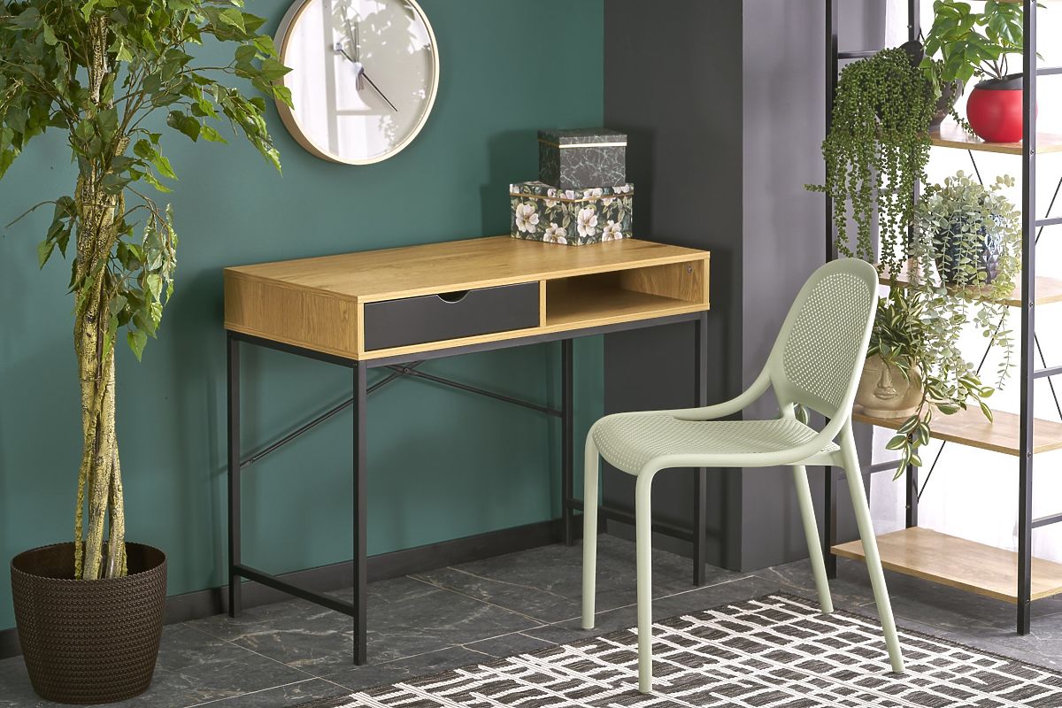 Písací stôl B-50 je ideálnou voľbou pre školákov, študentov aj domáci pracovný kút. Vďaka svojmu jednoduchému, ale modernému dizajnu v dekore zlatý dub doplnenom o čierne kovové nohy ľahko zapadne do každého interiéru – od študentskej izby až po domácu kanceláriu. Stôl ponúka praktické úložné riešenie v podobe jednej zásuvky a otvorenej police, kam môžete uložiť zošity, knihy, kancelárske potreby či drobnú elektroniku. Pracovná plocha je dostatočne veľká pre notebook, lampu aj ďalšie nevyhnutnosti. Lamino použité na výrobu stola je odolné proti poškriabaniu, preliačeniu aj znečisteniu, čo zaisťuje dlhú životnosť a jednoduchú údržbu.