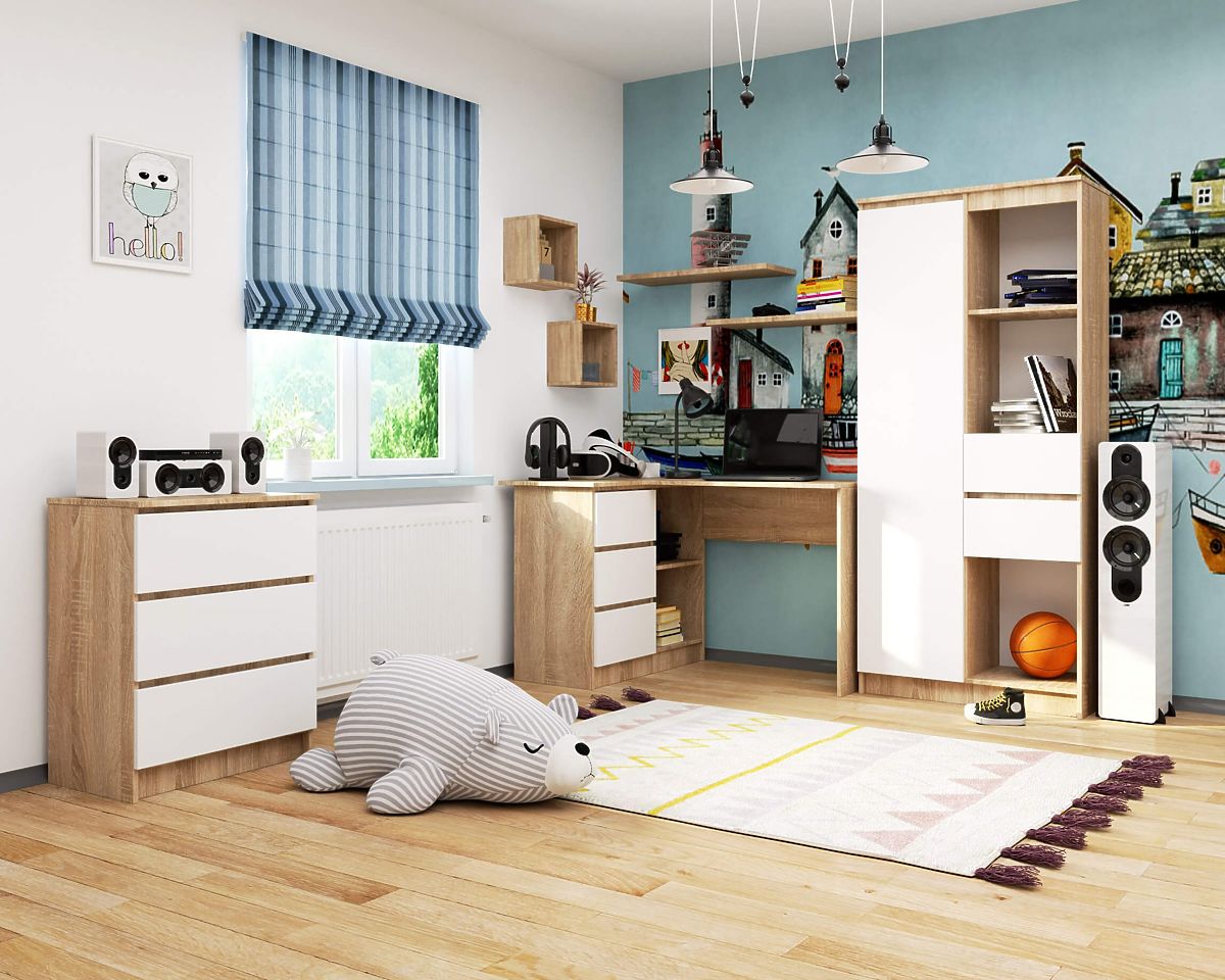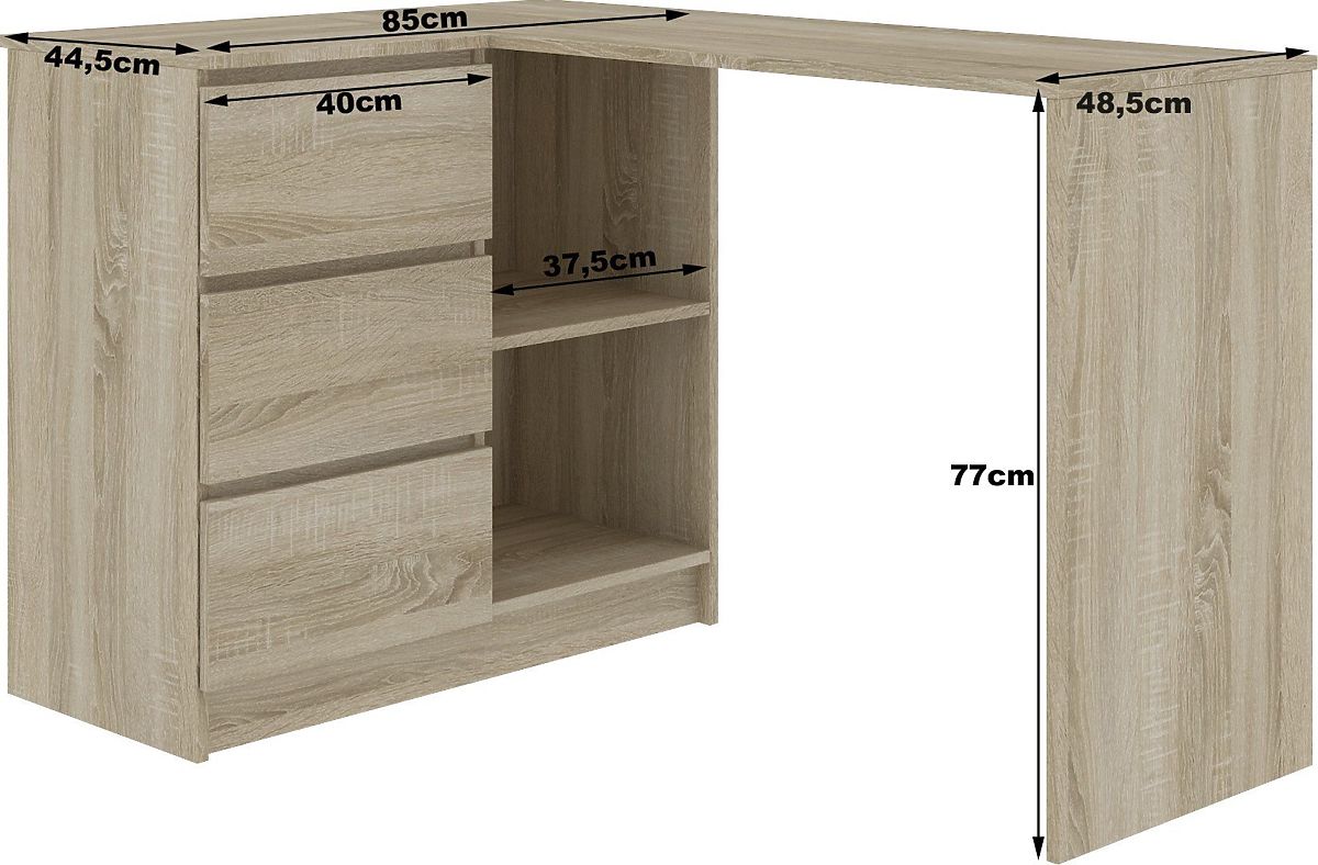 Babynabytek.sk » Detský nábytok / Stoly / Písacie stoly / ROHOVÝ PÍSACÍ STÔL B16 124 cm ĽAVÝ 3 ZÁSUVKY DUB SONOMA / BIELA