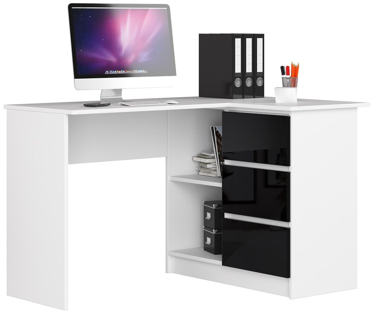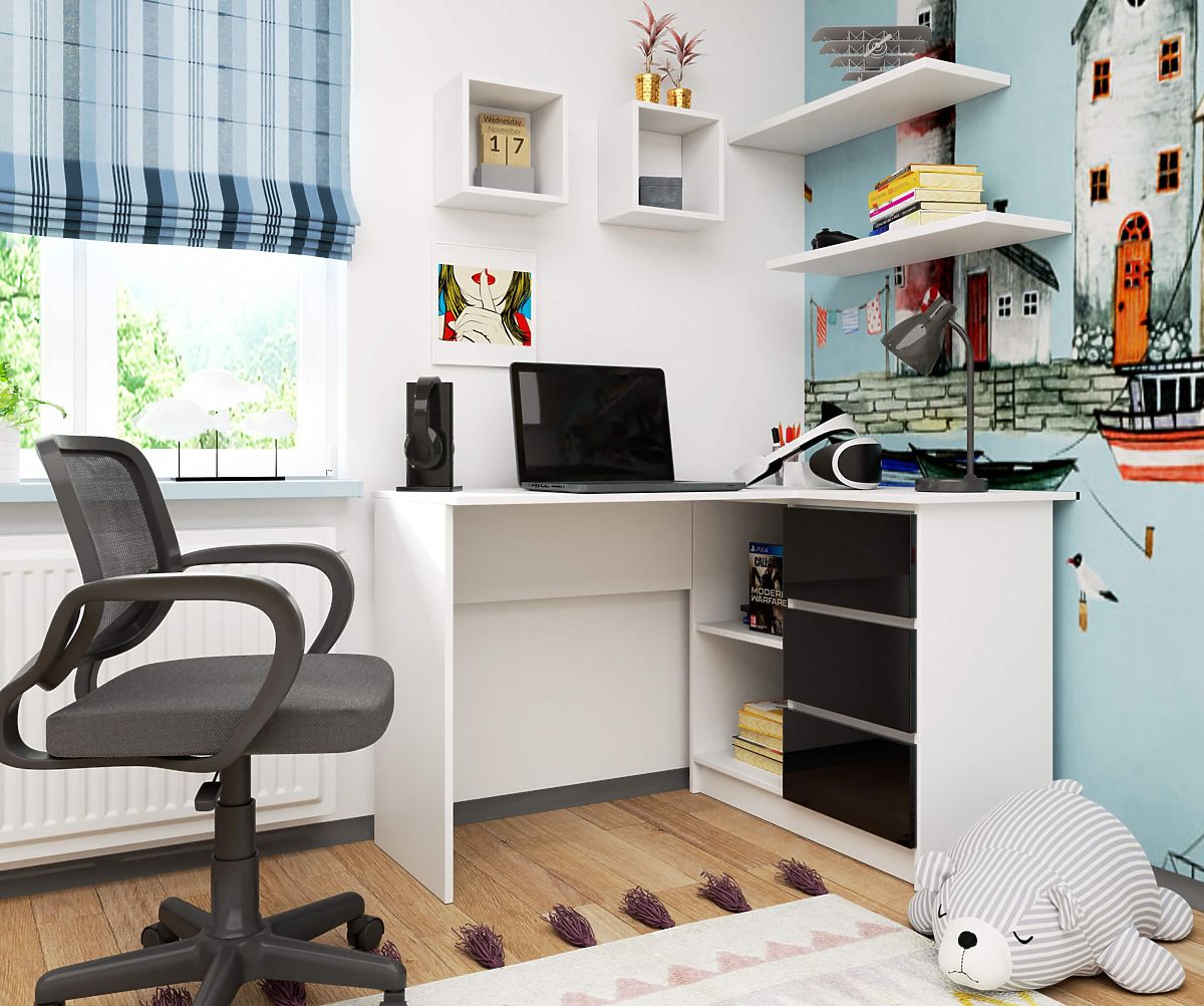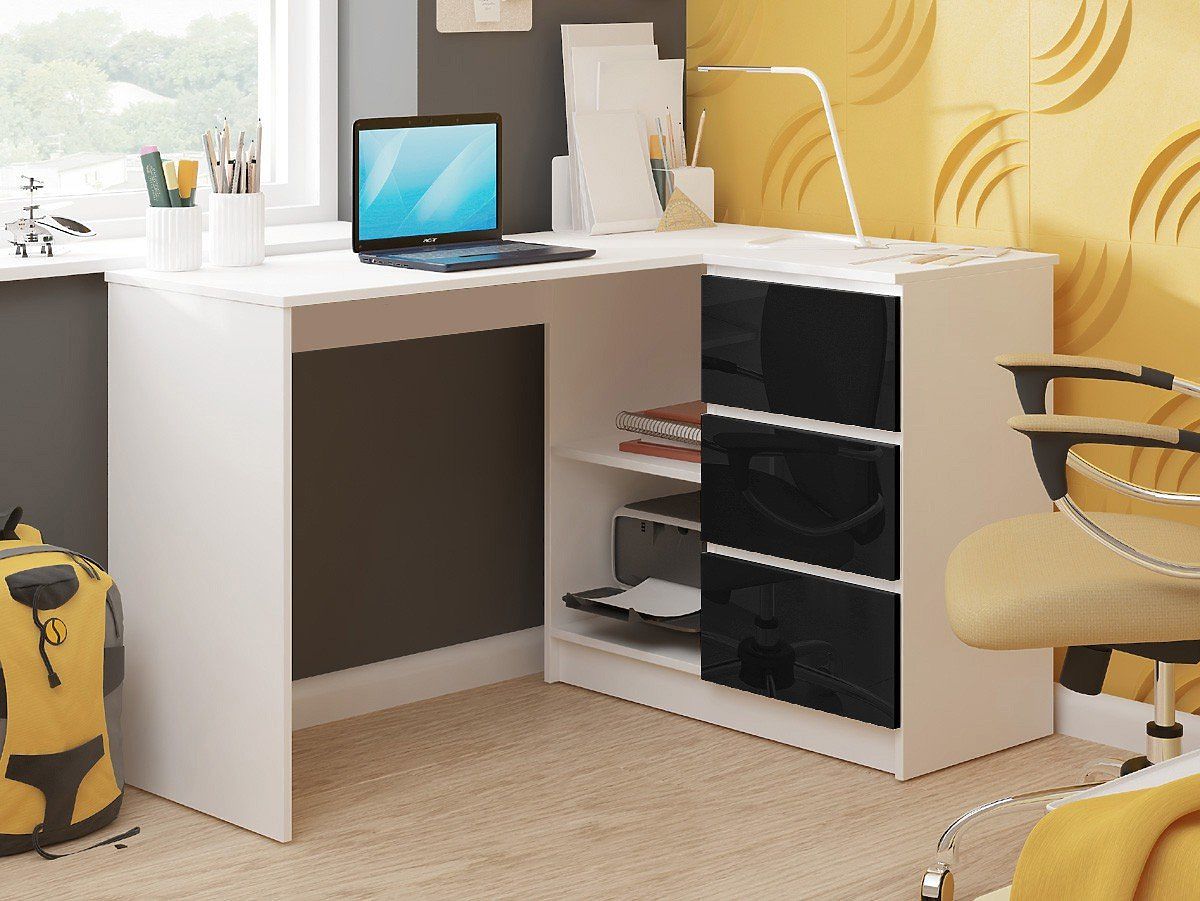 Babynabytek.sk » Detský nábytok / Stoly / Písacie stoly / ROHOVÝ PÍSACÍ STÔL B16 124 cm PRAVÝ 3 ZÁSUVKY PK BIELY / ČIERNY LESK