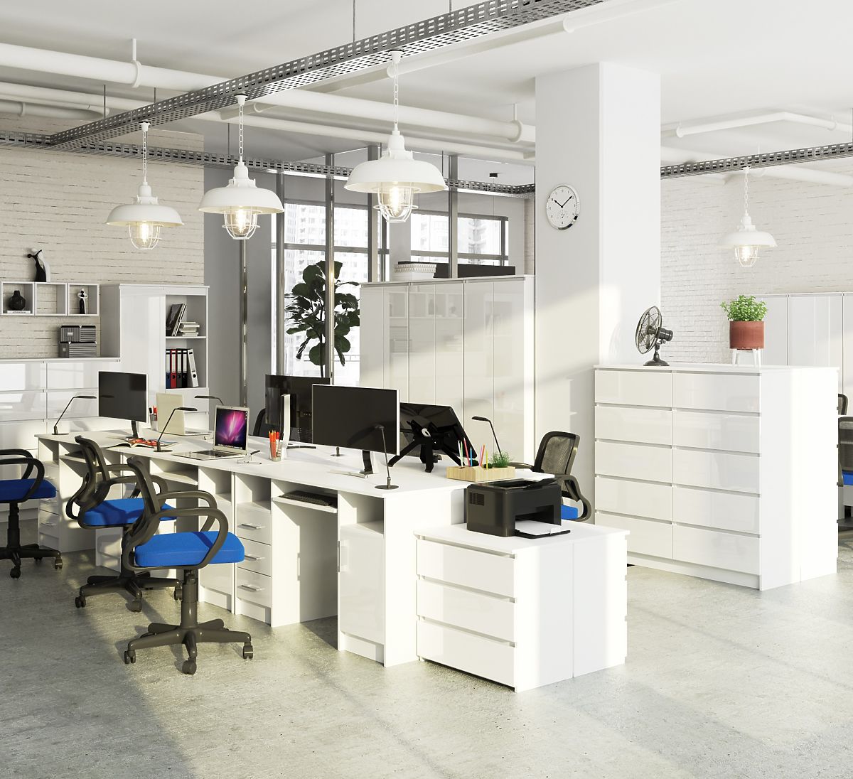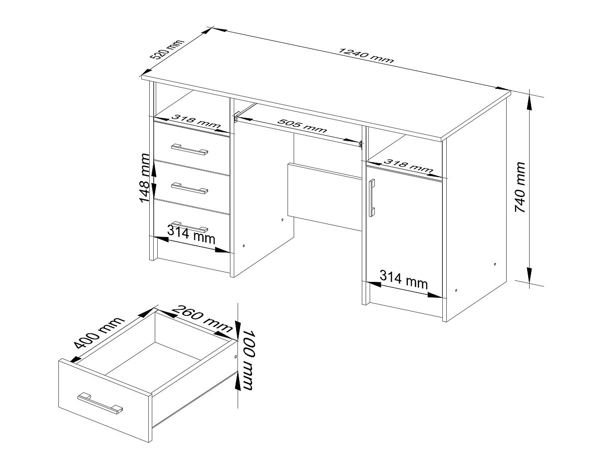 Predstavený písací stôl sa vyznačuje jednoduchou formou a elegantným vzhľadom - ideálny pre tých, ktorí si cenia funkčné a estetické riešenia. Nábytok je vyrobený z vysoko kvalitnej laminovanej dosky 16 mm, ktorá sa vyznačuje vysokou odolnosťou proti oderu. Jeho hrany sú olepené ABS hranou, čo zvyšuje ich odolnosť proti poškodeniu. Zaujímavosťou je, že čelá zásuviek a dvierok sú vyrobené z MDF dosky s vysokým leskom - vyznačuje sa najvyšším možným štandardom lesku. Nábytok je bielej farby a má strieborné úchyty. Písací stôl obsahuje tri zásuvky, dve otvorené police a jednu policu s dvierkami, čo poskytuje veľa priestoru na využitie. To umožňuje dobrú organizáciu práce, pretože dôležité príslušenstvo a zariadenia možno mať na dosah ruky. Rozmery stola sú 124 cm dĺžky, 74 cm výšky a 52 cm hĺbky. Nábytok je určený pre samostatnú montáž. Pomáha pri tom priložený návod. Písací stôl sa skvele hodí do pracovného prostredia aj domova.