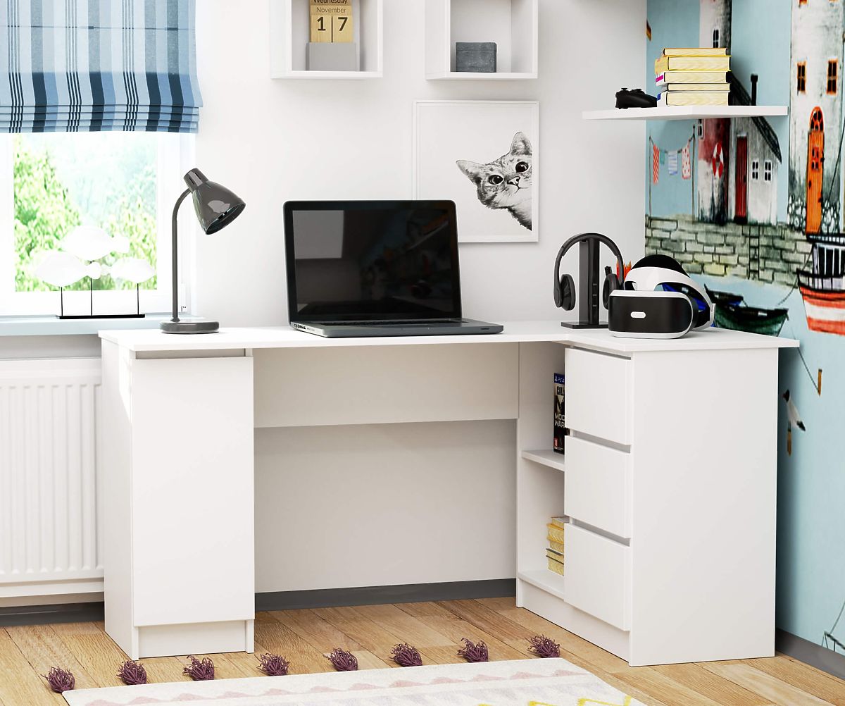 Biely rohový počítačový stôl so zásuvkami a skrinkou - B20