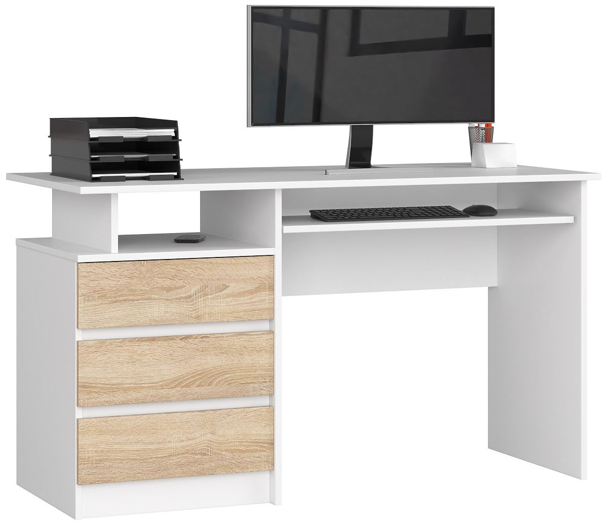 Písací stôl z laminovanej dosky s mnohými priestormi a výsuvnou poličkou na klávesnicu. .. viac