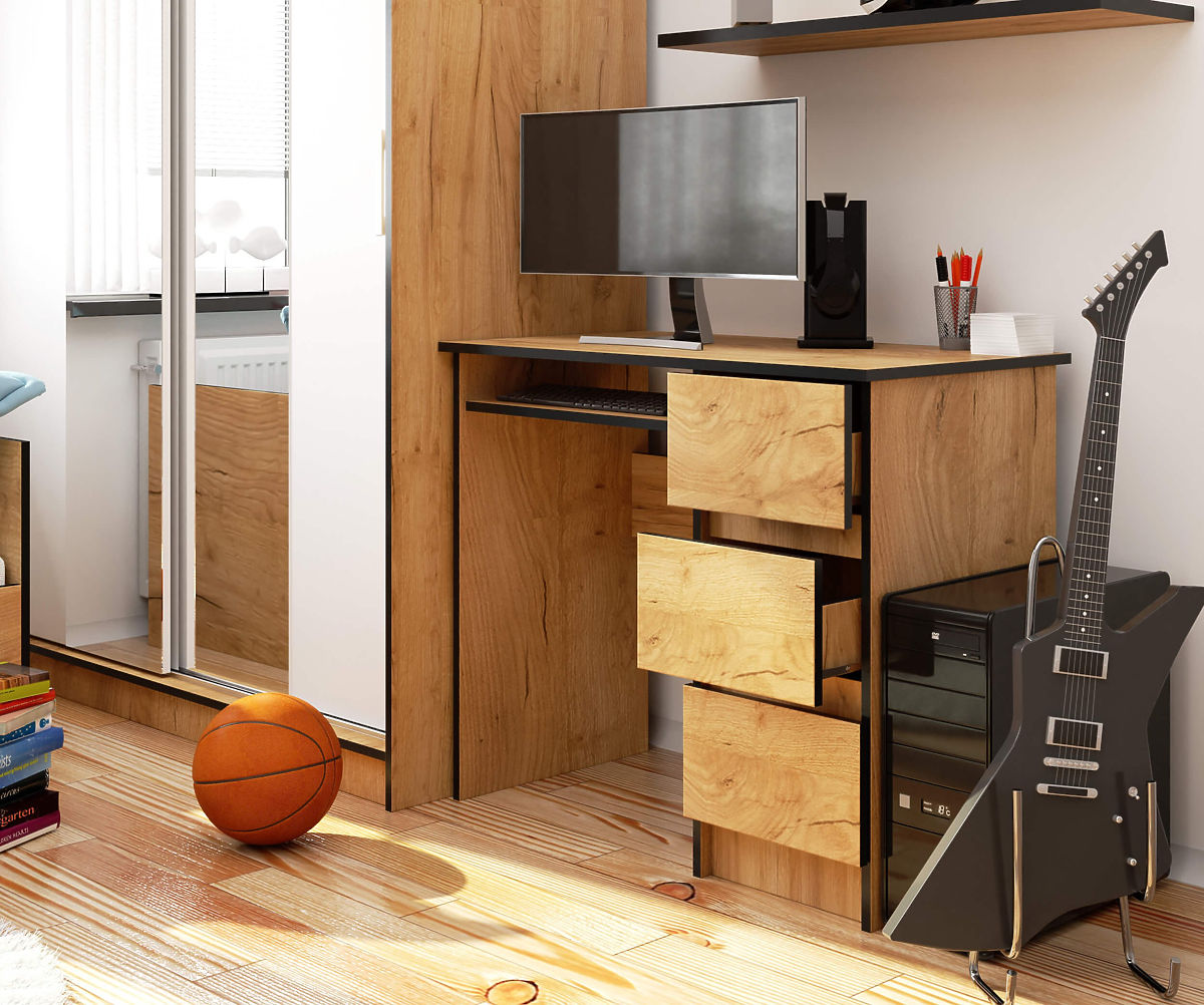 Písací stôl A-6 90 cm v odtieni dub craft, vďaka svojmu univerzálnemu a zároveň nadčasovému vzhľadu a charakteru, dokonale zapadne do klasického alebo moderného interiéru detskej či mládežníckej izby. Môže byť tiež úspešne využitý ako súčasť vybavenia domácej kancelárie. Všetko závisí od individuálnych potrieb a preferencií jednotlivca. Vďaka tomu, že je stôl vybavený 3 praktickými zásuvkami, získavame ďalší priestor na usporiadanie a ukladanie rôznych vecí, ktoré chceme mať po ruke.