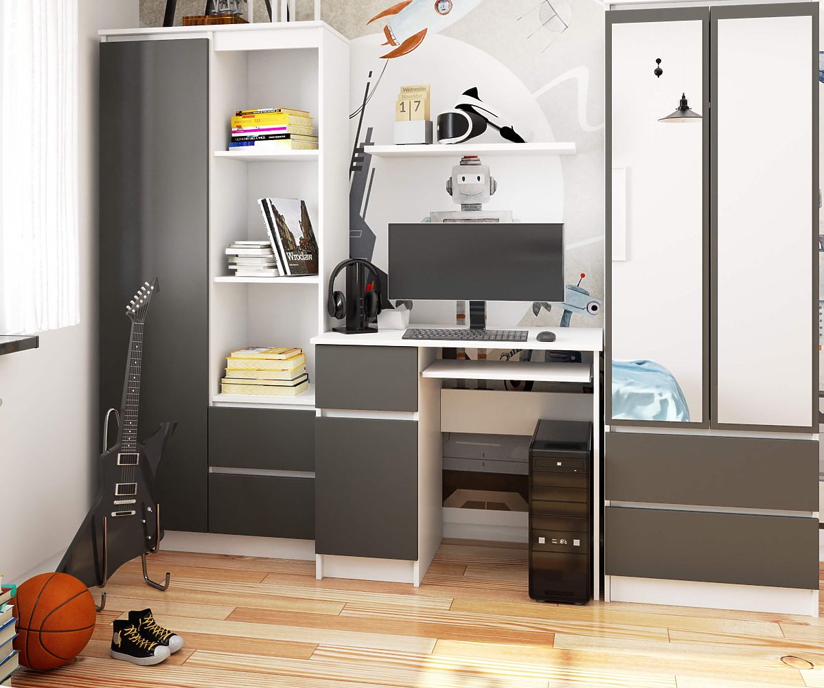 Počítačový stôl PIKSEL biely/grafitovo šedý je skvelý pre použitie v detskej, študentskej izbe, alebo v spálni či obývacej izbe, kde je vyhradený kút pre prácu z domu alebo štúdium. Uplatní sa tiež v malých kancelárskych priestoroch, kde skvele ladí s ďalším nábytkom v bezúchytkovom systéme.