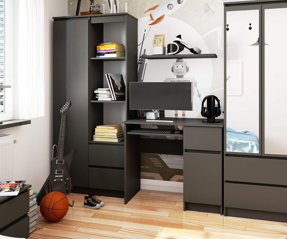 Voľne stojaci stôl PIKSEL 90 cm v farbách GRAFIT ŠEDÁ je ideálnym riešením pre malé interiéry. Veľmi dobre poslúži ako školský alebo počítačový stôl. Jeho ergonomická konštrukcia zaisťuje pohodlie pri používaní. Stôl je vybavený výsuvnou policou na klávesnicu, praktickou bočnou zásuvkou a skrinkou s policou, do ktorej sa ľahko zmestia šanóny a knihy. Na výrobu stola bola použitá príjemná na dotyk a ľahko udržiavateľná matná doska pokrytá odolnou laminátovou vrstvou. Celok dopĺňajú praktické úchyty v striebornej farbe.