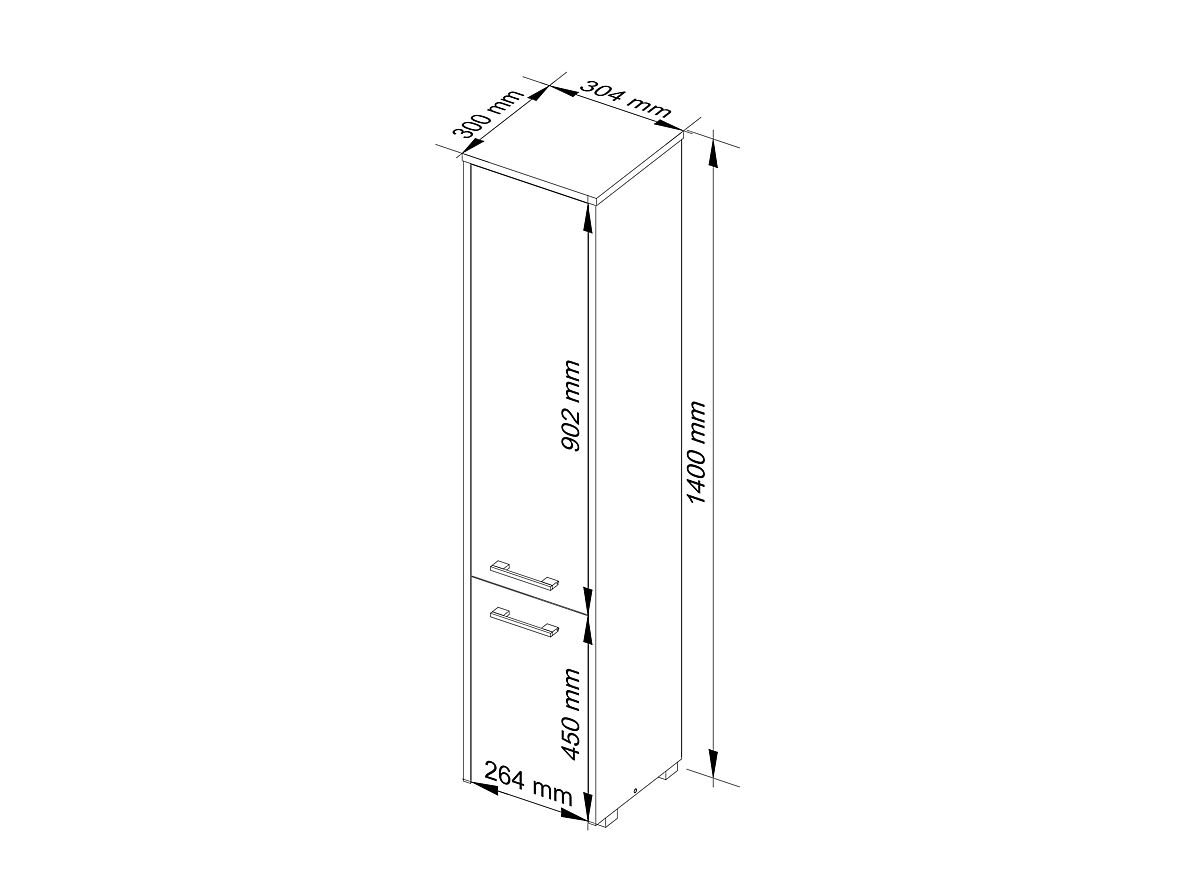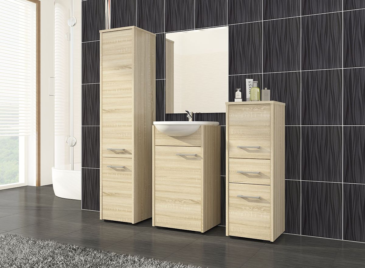 Vysoká kúpeľňová skrinka Fin 2 dvere je univerzálny nábytok, ktorý možno využiť v každej kúpeľni, bez ohľadu na jej veľkosť. Elegantný dizajn a farba dub sonoma zaisťujú, že skrinka dokonale zapadá do kúpeľne v akomkoľvek štýle, s klasickým alebo moderným vybavením, a k dlaždiciam a keramike v rôznych odtieňoch. Vďaka svojim rozmerom môže vysoká kúpeľňová skrinka vyplniť často nevyužitý priestor v rohu kúpeľne, rovnako ako byť umiestnená vedľa umývadla, automatickej práčky alebo sprchového kúta. Stojaca kúpeľňová skrinka Fin sa vyznačuje veľmi precíznym spracovaním. Má dvoje pohodlné a široké dvierka s ergonomickými úchytmi, ktoré zaručujú pohodlný prístup do vnútra nábytku. Hlboké a priestranné police sa skvele hodia na uloženie uterákov, toaletných potrieb, kozmetiky alebo čistiacich prostriedkov v skrinke. Vysoká kúpeľňová skrinka je vyrobená z laminovanej dosky odolnej proti oderu a vode. ABS hrany, ktorými je skrinka zakončená, sú odolné, neodfarbujú sa a dodatočne chránia skrinku pred poškodením.