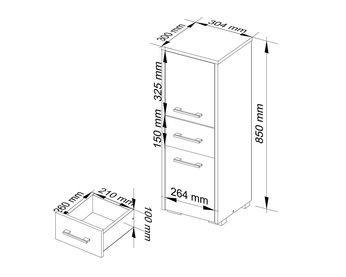 Ak vo svojom okolí preferujete funkčný nábytok, regály by mali byť súčasťou každej miestnosti. Aj kúpeľne. Naša ponuka zahŕňa okrem iného kúpeľňový regál FIN 2D 1SZ, vyrobený z vysoko kvalitnej laminovanej dosky firmy kronospan 16 mm. Jeho hrany pokrýva spoľahlivá ABS hrana. Vďaka tomu skrinka zaisťuje odolnosť proti vlhkosti, oderu a tiež mechanickému poškodeniu. Dolná časť regálu je uzatvárateľná skrinka. Slúži na ukladanie textílií, domácej chémie alebo kozmetiky väčších rozmerov. V strednej časti stĺpu je výsuvná zásuvka. Môže slúžiť ako lekárnička alebo na uloženie kozmetiky po ruke. Horná časť regálu zaberá uzatvárateľná skrinka, rozdelená policou. Toto miesto je najčastejšie využívané na usporiadanie kozmetiky. Dvierka regálu zdobia strieborné úchyty.
