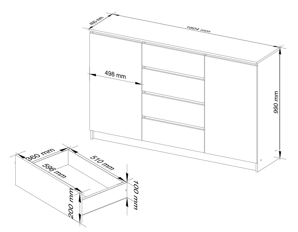 KOMODA K160 2 DVERÍ 4 ZÁSUVKY Veľká a priestranná komoda v modernom dizajne.