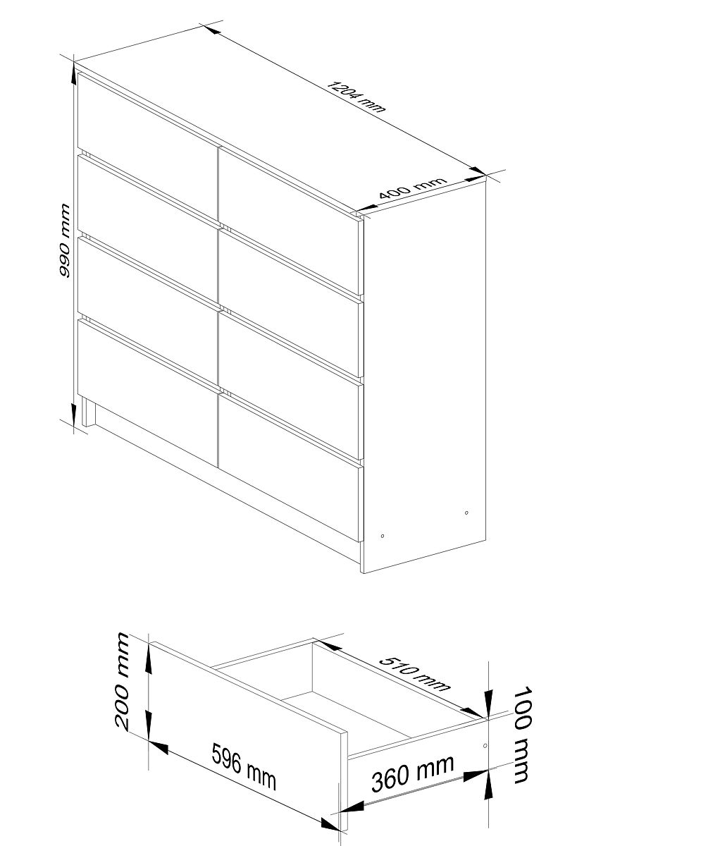 Krásna, moderne navrhnutá komoda, ktorá môže byť úspešne využitá v obývacej izbe, spálni alebo jedálni, je produkt vysokej kvality. Nábytok je vyrobený z laminovanej dosky o hrúbke 16 milimetrov, odolnej proti oderu, odolný a krásne sa prezentujúci v každom interiéri. Hrany komody sú olepené ABS hranou. Biele čelá sa dokonale hodia k súčasným trendom a zvláštnu pozornosť si zaslúži pevná konštrukcia nábytku, ktorý je vybavený ôsmimi priestrannými zásuvkami. Zásuvky sa pohybujú na kovových guľôčkových pojazdoch a celý nábytok je určený na samostatnú montáž. Je to ponuka pre tých, ktorí chcú ísť s duchom doby, a zároveň si vyberajú nábytok dostupný v nadčasovej, univerzálnej farebnosti. Komodu je možné kombinovať s iným nábytkom v rovnakom štýle, ktorý je tiež súčasťou našej ponuky. Odporúčame sa bližšie zoznámiť s naším bohatým sortimentom dostupným za výhodnú cenu.