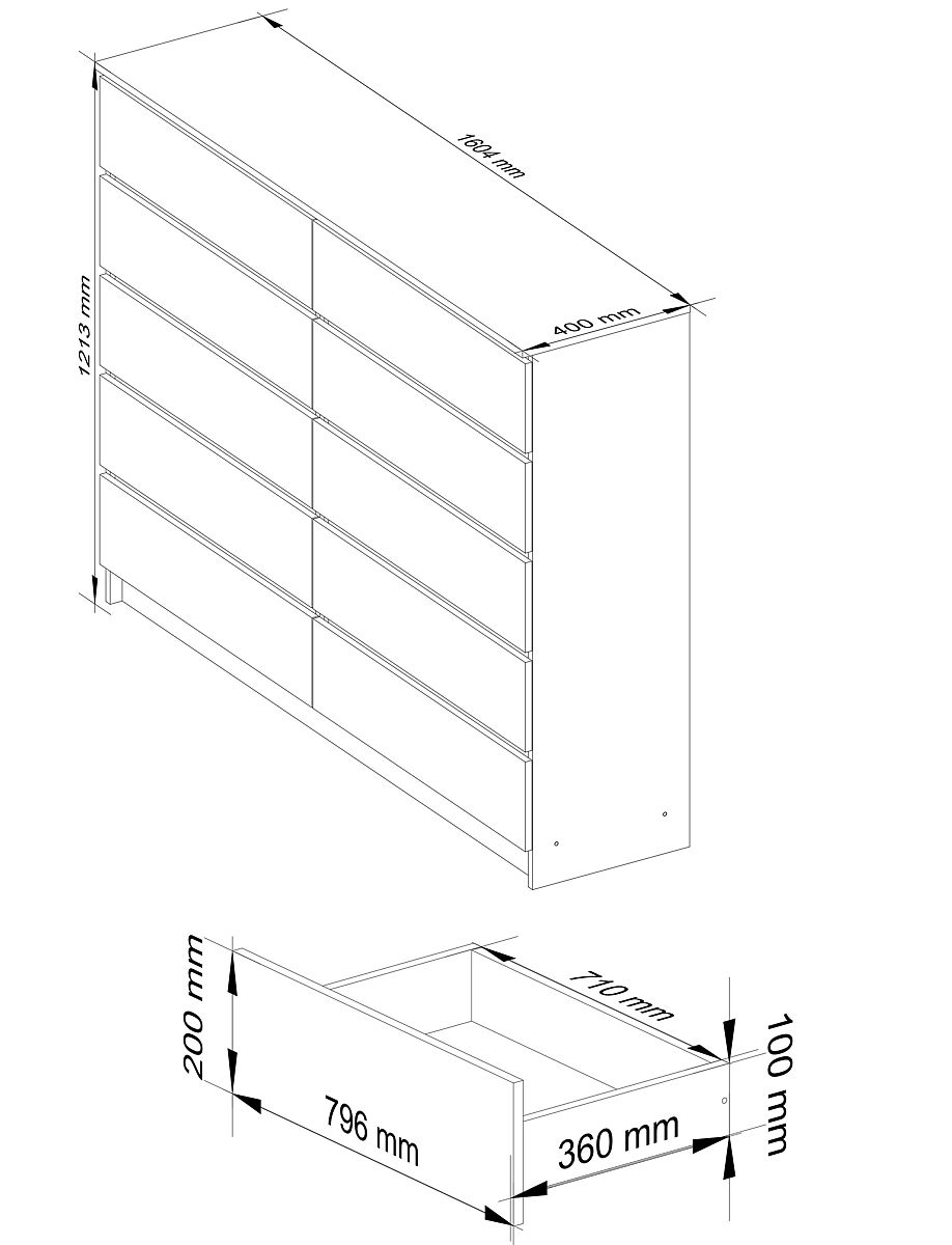 Komoda sa skladá z 10 zásuviek, čo poskytuje veľa voľného priestoru na využitie. Všetky zásuvky sa pohybujú hladko a ticho vďaka kovovým valčekovým vodičom. Nábytok je teda veľmi funkčný. Zároveň vyzerá bezchybne. Je jednoduchý vo forme, takže ho možno prispôsobiť rôznym typom miestností a ich aranžmánom.