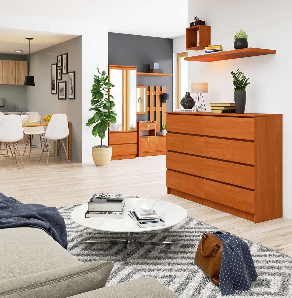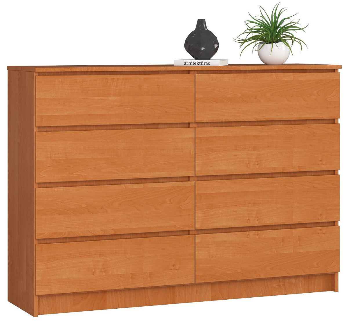 Komoda K140 v farbe jelša je určená pre milovníkov tradične zariadených interiérov. Univerzálna farba a jednoduché tvary nábytku zaisťujú, že sa veľmi dobre hodí do takých priestorov, ako sú kancelárie, hotelové izby, ale aj obytné interiéry - obývacie izby, spálne, predsiene či jedálne. Charakteristickými znakmi tejto komody sú predovšetkým nadčasový dizajn, pevná konštrukcia, praktické využitie a jednoduchá údržba. Produkt vybavený ôsmimi priestrannými zásuvkami umožňuje ukladanie dokumentov, odevov a mnohých ďalších potrebných predmetov v danej miestnosti. Výhodná cena nábytku je jeho ďalším plusom. Odporúčame tiež oboznámiť sa s ďalšími prvkami vybavenia dostupnými v rámci tejto série.
