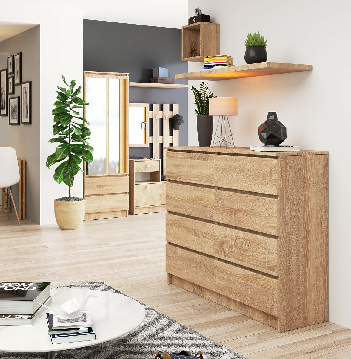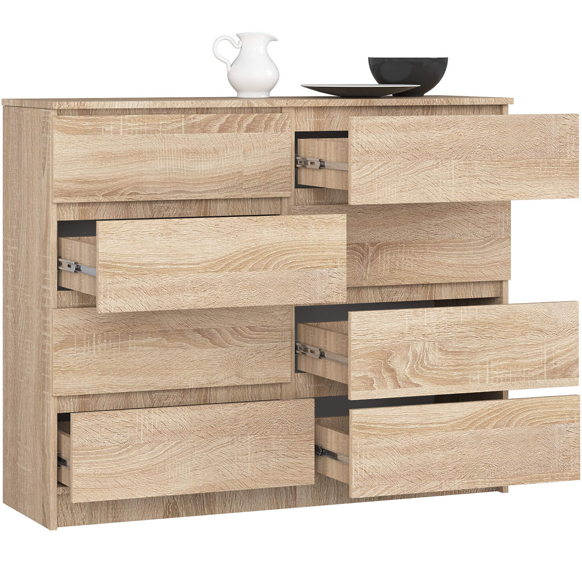 Osem zásuviek, ktoré pojmú všetky potrebné veci v danej miestnosti, a široká 120 centimetrov doska - to je komoda K120 v módnej farbe dub sonoma. Vysoko kvalitný produkt sa vyznačuje pevnou konštrukciou zaisťujúcou trvanlivosť výrobku a univerzálnym dizajnom. Ďalšou výhodou funkčného nábytku, ktorý sa bude skvele vynímať v obývacej izbe, spálni, jedálni alebo kancelárii, je atraktívna cena. V našom internetovom obchode môžu zákazníci tiež očakávať ďalšie návrhy interiérového vybavenia vo farbe dub sonoma, ktoré príjemne prekvapia svojou praktickosťou ako v kancelárii, tak doma. Odporúčame využiť našu ponuku a zostaviť si sadu prispôsobenú konkrétnym potrebám.
