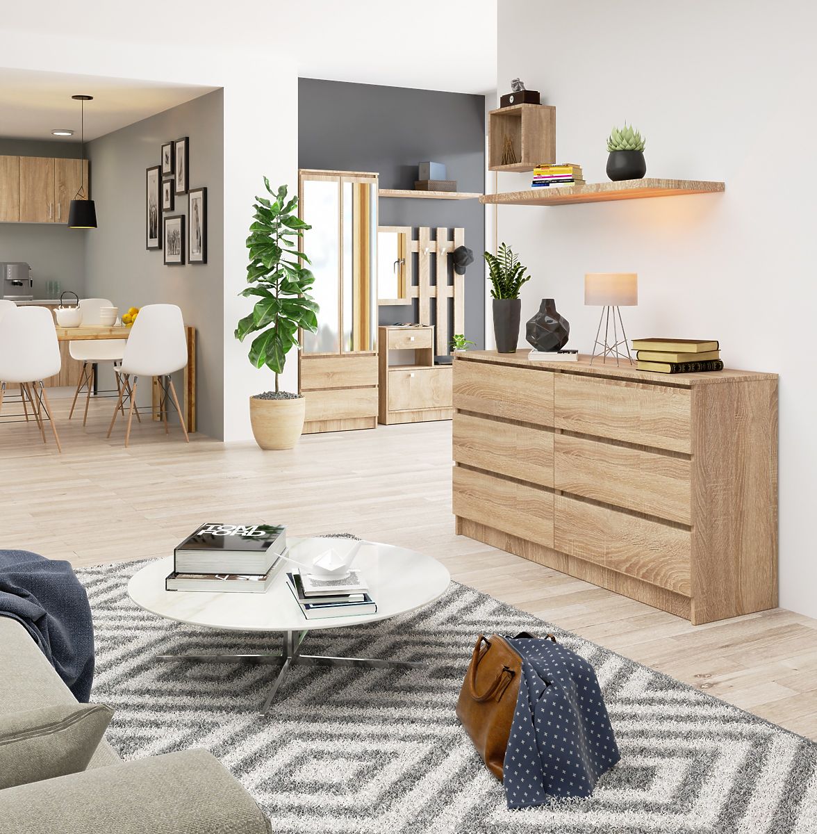 Šesť praktických zásuviek, dlhá doska a farba, ktorá sa teší najväčšej obľube medzi ľuďmi preferujúcimi ľahko čistiteľný, univerzálny a nadčasový nábytok - to sú vlastnosti, ktoré charakterizujú komodu K140 vo farbe dub sonoma. Táto ponuka si zaslúži pozornosť predovšetkým vďaka svojmu dizajnu a výnimočnej funkčnosti, ale stojí za to venovať pozornosť aj vysokej kvalite a precíznemu spracovaniu nábytku, ktorý môže byť úspešne použitý ako v kancelárskych priestoroch, tak v obývacej izbe, jedálni, spálni alebo mnohých ďalších obytných interiéroch. Solídne spracovanie z odolných materiálov určite ocenia aj najnáročnejší zákazníci, pre ktorých bude výhodou nábytku aj jeho priaznivá cena.