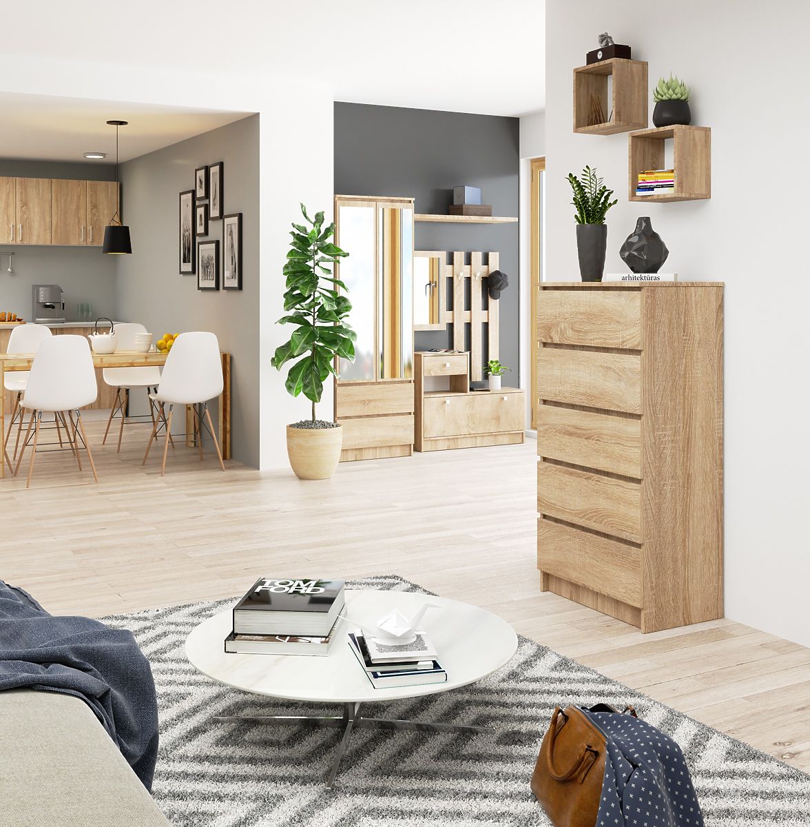 Exemplár v krásnej farbe sonoma má päť priestranných zásuviek pracujúcich na trvanlivých guľôčkových pojazdoch. Zásuvky sa vysúvajú a zasúvajú veľmi jemne. Komoda má presne 60 centimetrov dĺžky, výška modelu je 121 centimetrov, zatiaľ čo hĺbka činí 40 centimetrov. Laminovaná doska použitá pri výrobe má 16 milimetrov, ABS hrany zvyšujú trvanlivosť a predlžujú životnosť nábytku. Celková hmotnosť komody dostupnej v našej ponuke je presne 36 kilogramov.