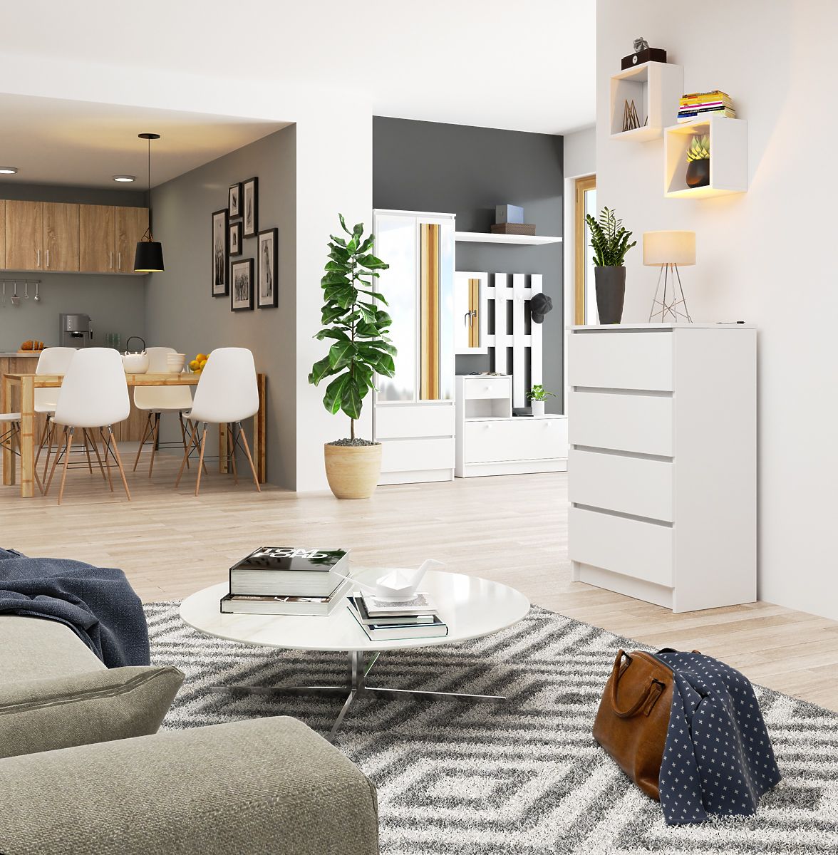 Vysoká komoda v bielej farbe je zaujímavou voľbou, ktorú možno využiť ako v obytnom priestore, tak v kancelárskych priestoroch. Funkčný nábytok sa skladá zo štyroch zásuviek vyrobených z laminovanej dosky s hrúbkou 16 milimetrov. Materiál vykazuje vysokú odolnosť proti oderu, čo ovplyvňuje trvanlivosť a pevnosť komody. Pozornosť si zaslúži jej moderný dizajn - jednoduchosť a elegancia a minimalistický štýl, v ktorom je udržiavaná. Lacná, ale veľmi efektná voľba určite dokonale splní svoju funkciu, umožňujúca ukladanie mnohých potrebných predmetov v predsieni, jedálni, obývacej izbe, izbe pre mládež alebo spálni. Produkt určený na samostatnú montáž sa vyznačuje mimoriadne precíznym a solídnym spracovaním.