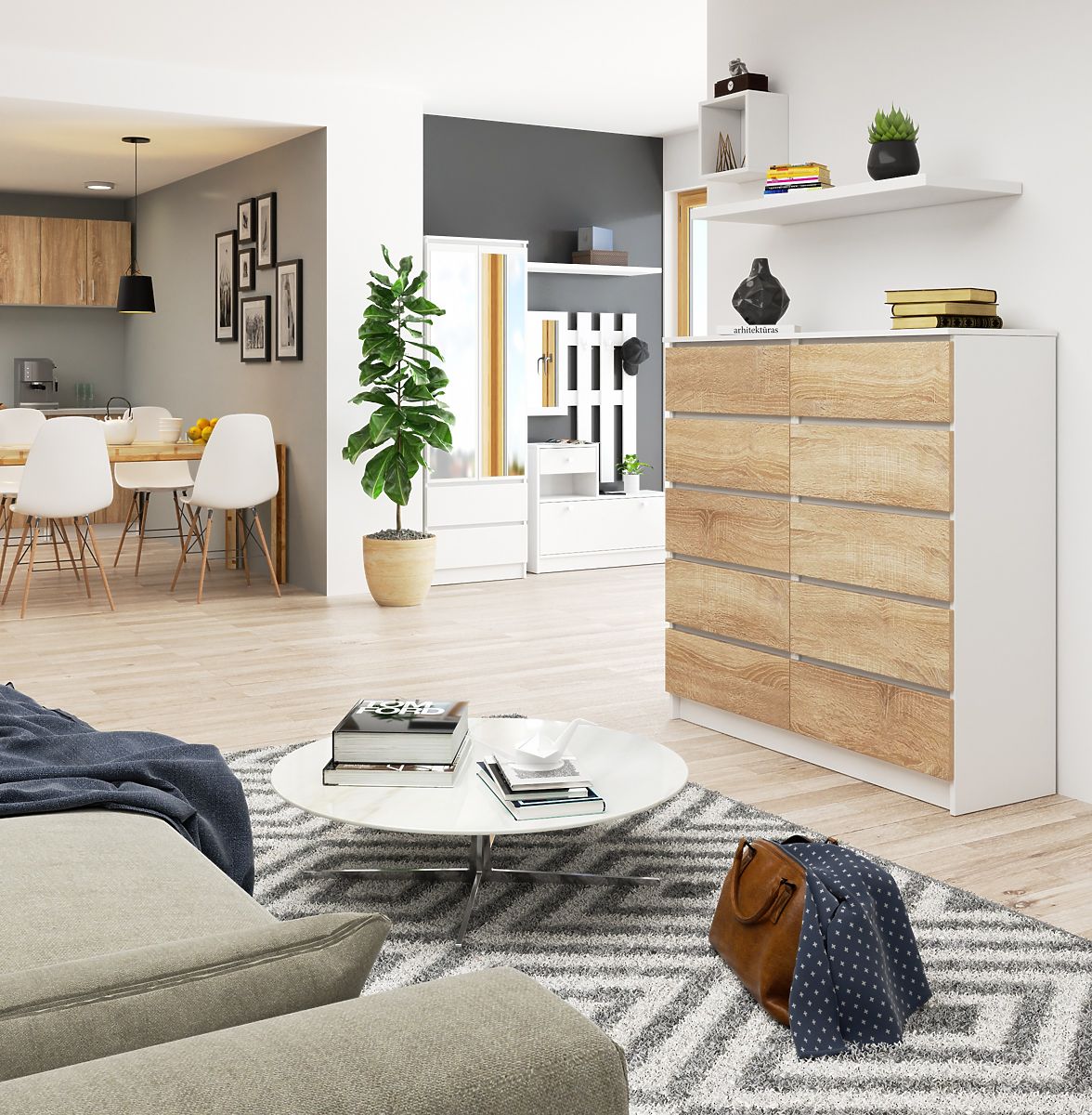 Komody sú funkčný nábytok, bez ktorého si ťažko predstaviť bývanie. Umožňujú usporiadať textílie a ďalšie predmety. Niekedy ich je naozaj veľa. V takom prípade sa oplatí zvoliť bielu komodu K 120 cm s čelami zásuviek v farbe sonoma - obsahuje až 10 zásuviek, čo poskytuje veľa voľného priestoru na využitie. Najlepšie ju umiestniť do obývacej izby, spálne alebo predsiene.
